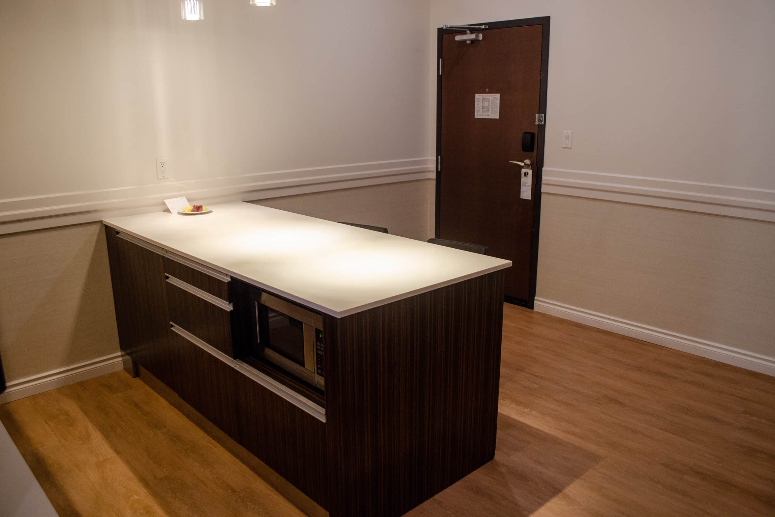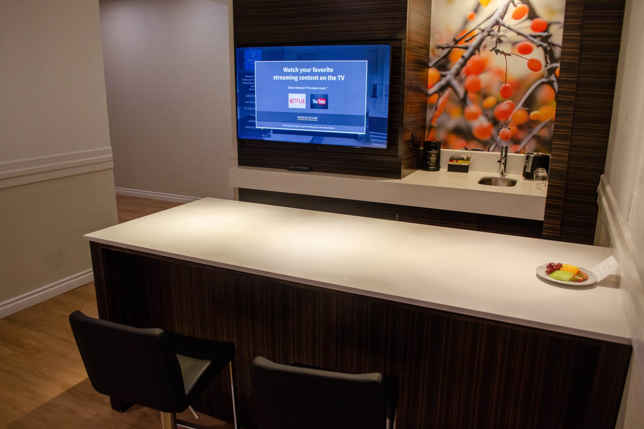 Immediately upon entry is an island that functions as a breakfast bar, with seating for two. On the wall opposite the island is a large television, as well as a mini-fridge, sink, microwave, and some empty cabinets.