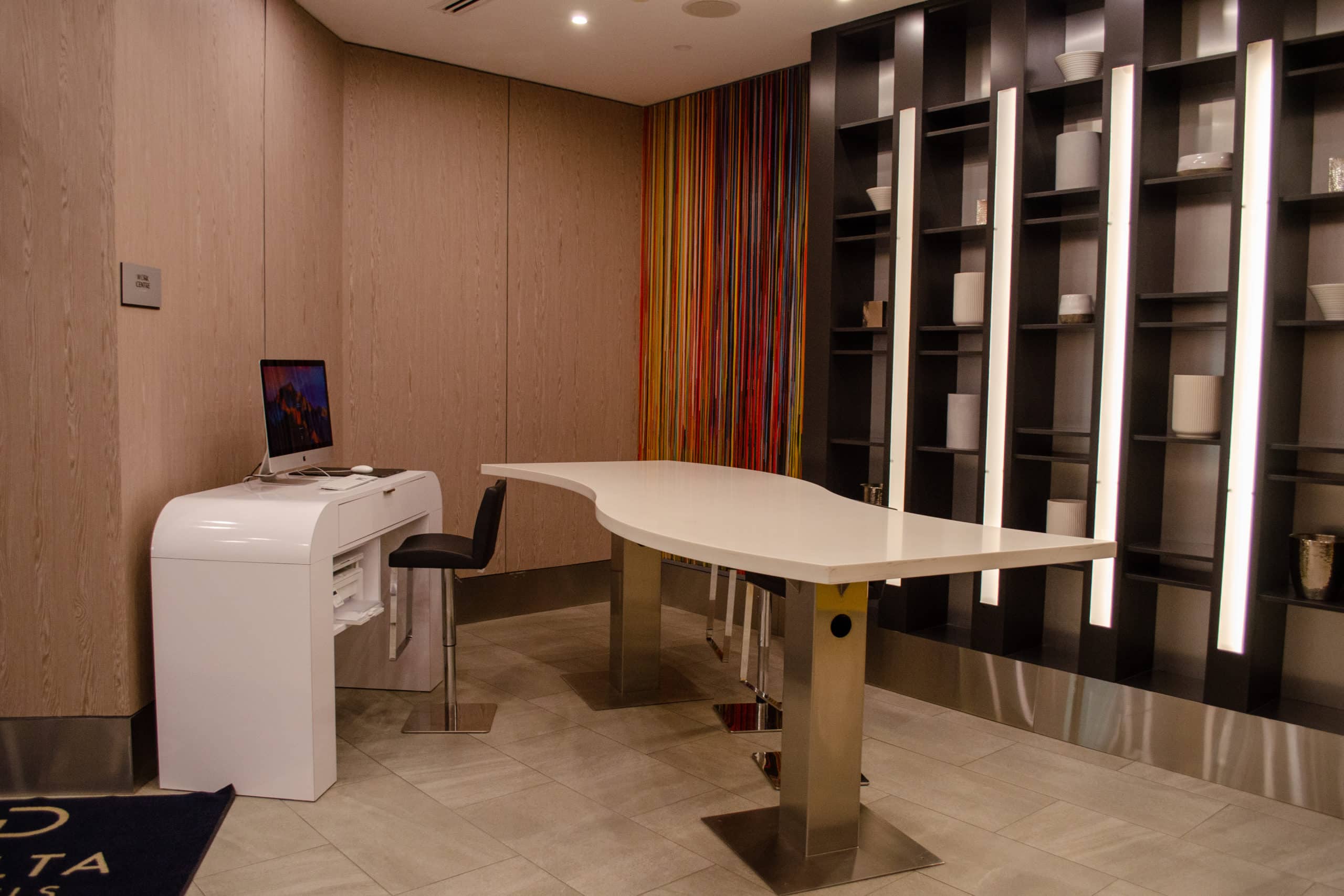 In the lobby lounge is a small work centre with a single iMac set up next to a large table without chairs or stools.