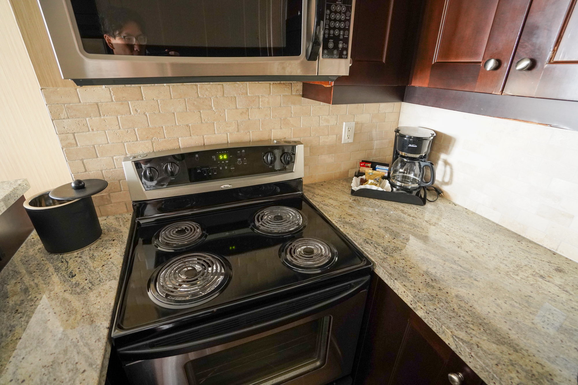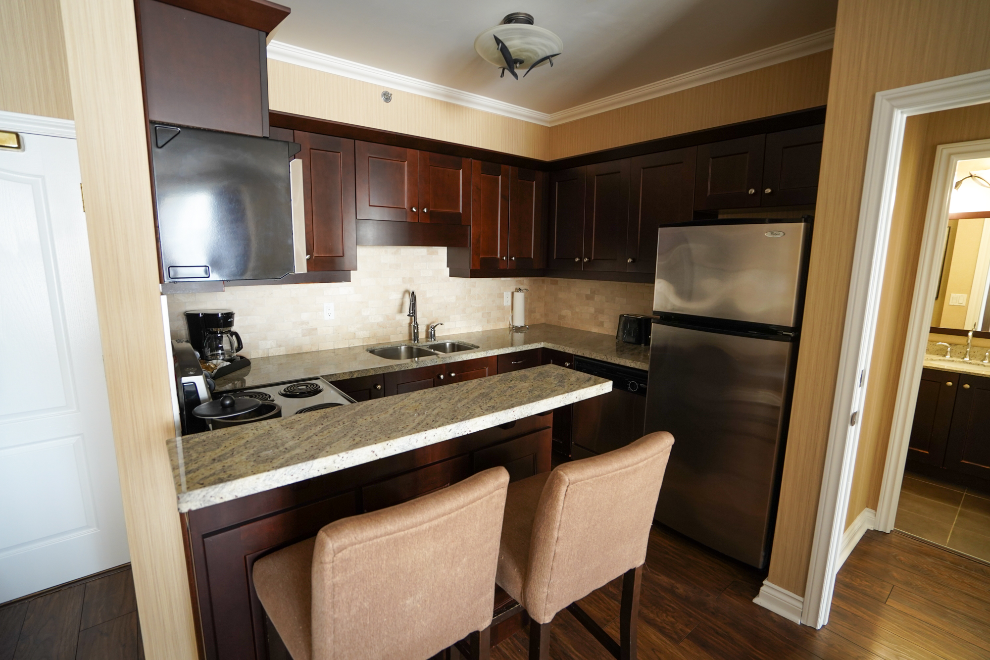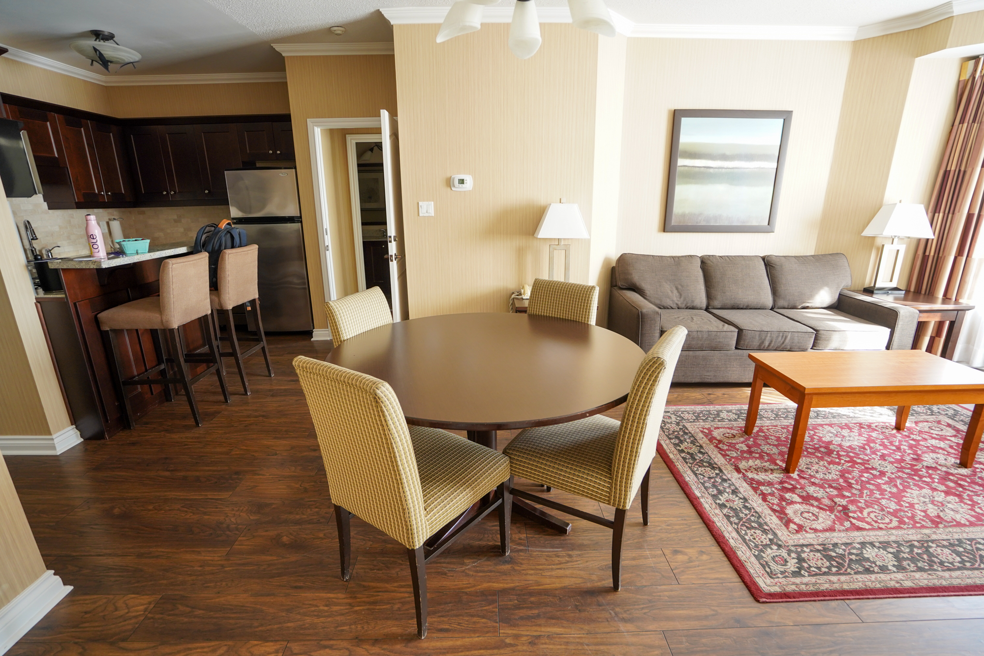 The suite was equipped with a full kitchen, allowing us to cook our own meals if we wanted. We never made use of the stove and oven, preferring to eat around town instead, although the full-sized refrigerator was certainly helpful for storing – to cherry-pick one example – the cherries we picked from a nearby farm.