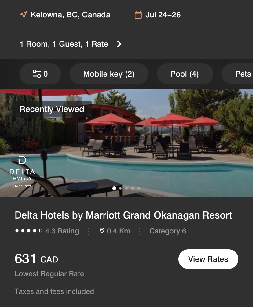 No worries, though – at least I had some Marriott Bonvoy points on hand. At Category 6 peak pricing, I was looking at dropping 60,000 points per night for a weekend in Kelowna… but at least it’s good value, right? Right?