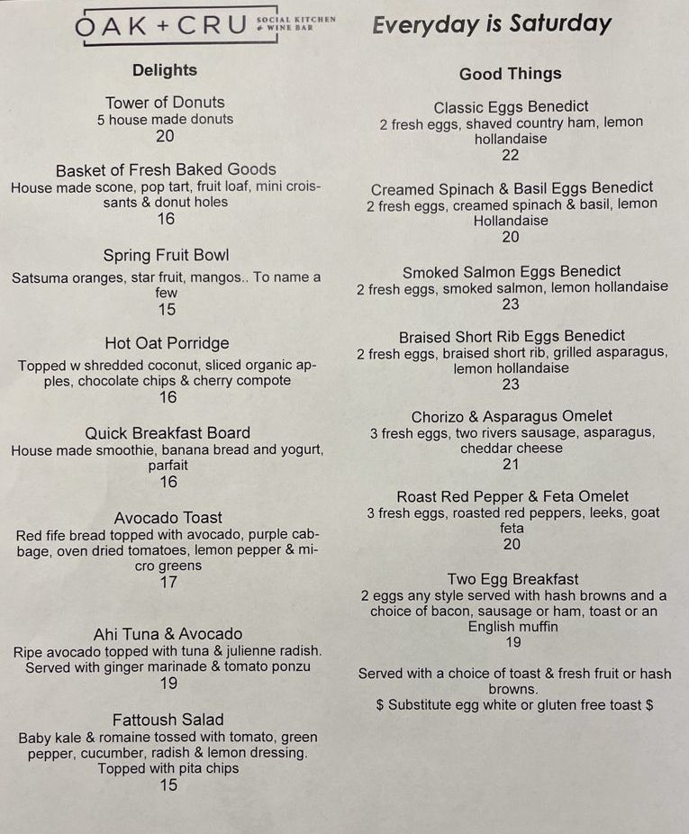 The ahi tuna and avocado salad was also delicious, although its limited portion size made it more of a shared dish than a breakfast entrée. No worries, though, as we needed to use up our extra $20 OAK + CRU voucher anyway, and the server was more than happy to split the bill and get around the “one voucher per visit” rule.