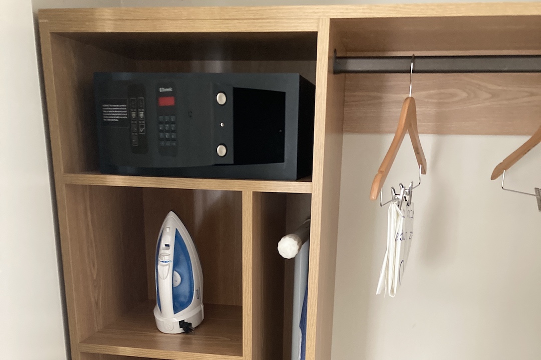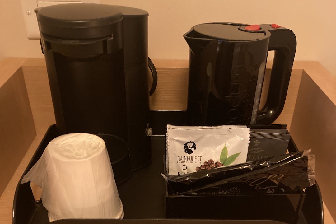 Other amenities include a safe, an iron and ironing board, and a hot/cold hydration station with coffee, tea, a kettle, and an ice bucket.