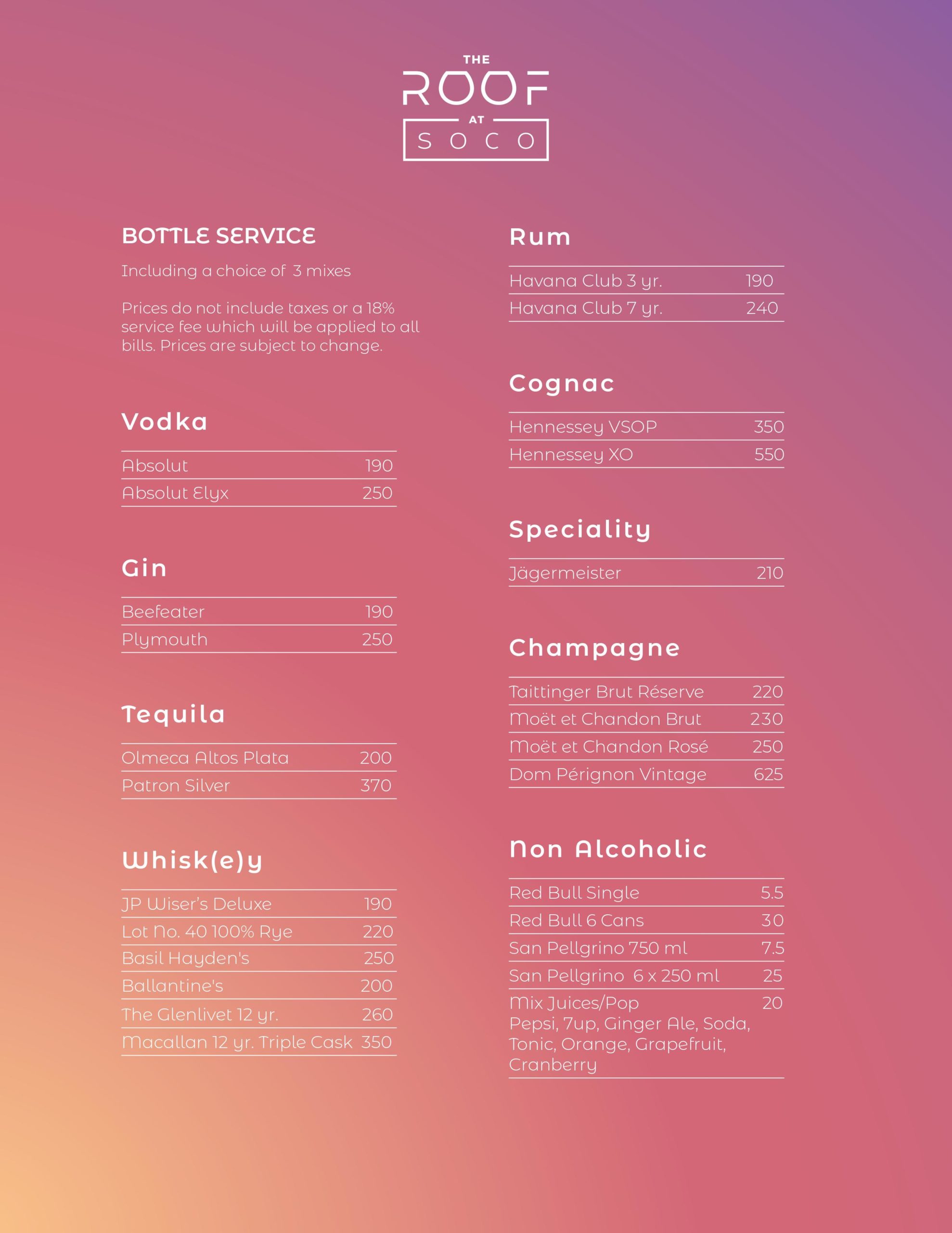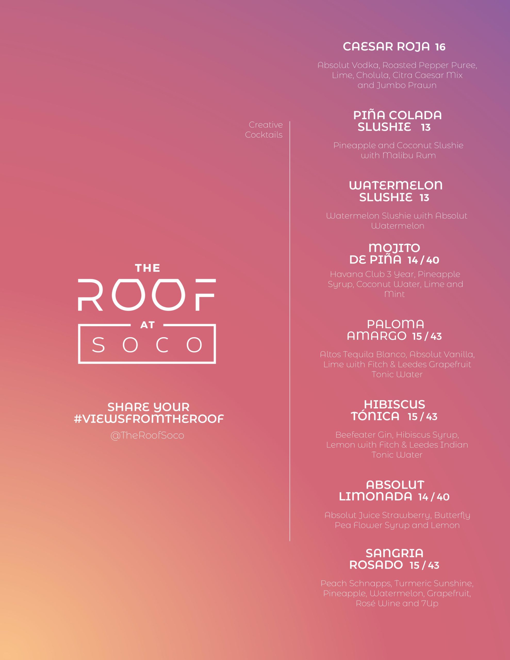 The bar has a selection of cocktails by the glass or pitcher, wine, craft beer, and bottle service for spirits and sparkling wine. The menu features drinks with a summer theme.
