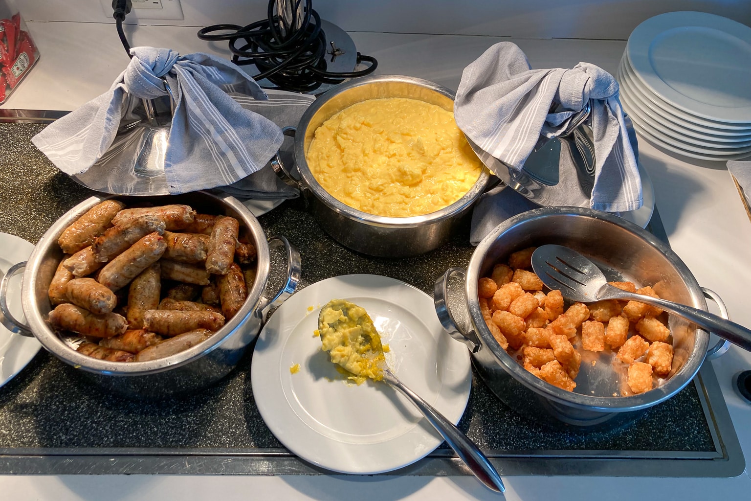 The kitchen was running an à la carte breakfast menu, with a full meal and beverages included for Platinum members and above, in lieu of a buffet in the lounge.