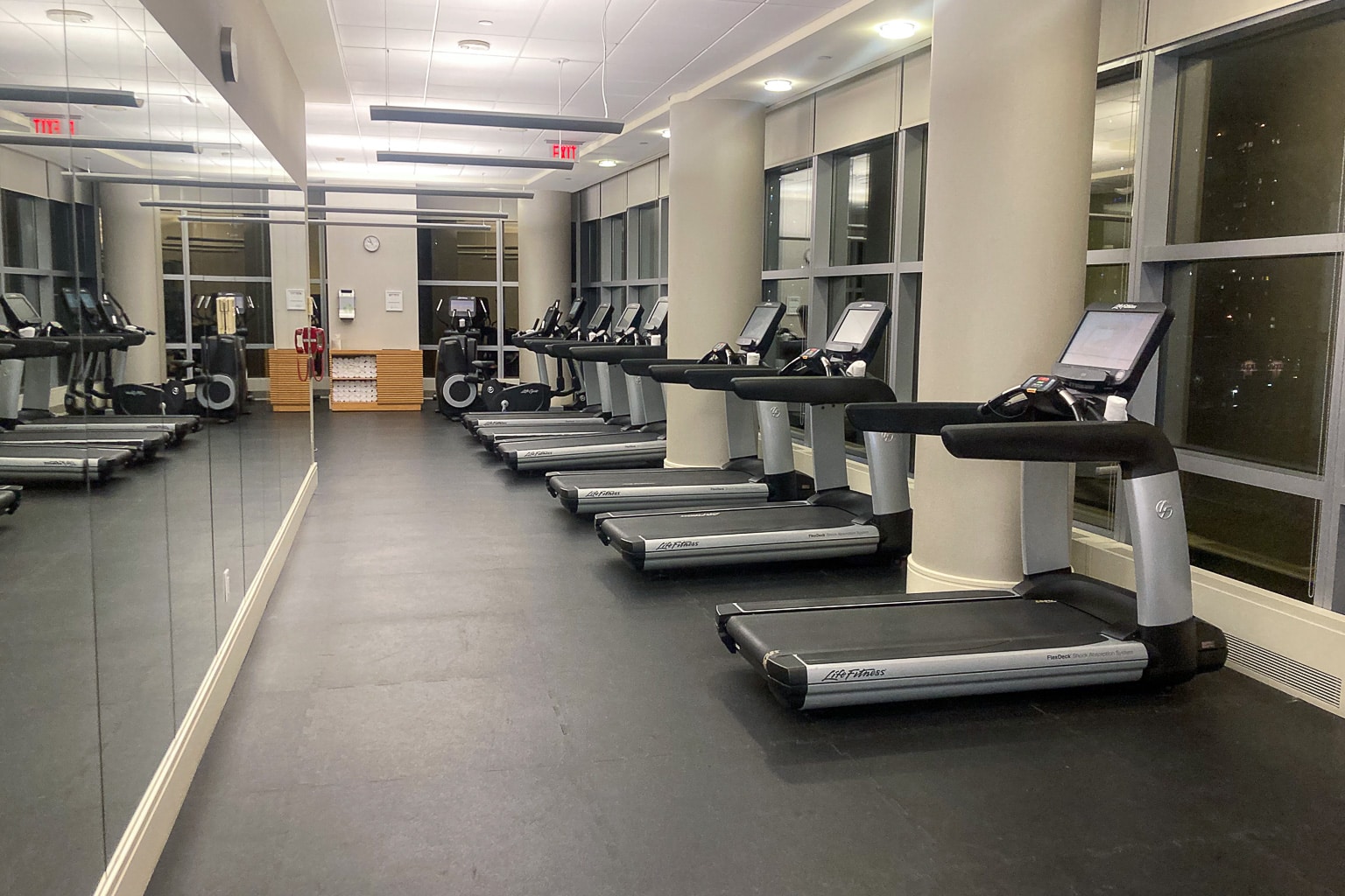 The gym and pool are on the 4th floor, on the same level as The Roof, and directly accessible from both elevator banks whether for low-floor or high-floor guest rooms.