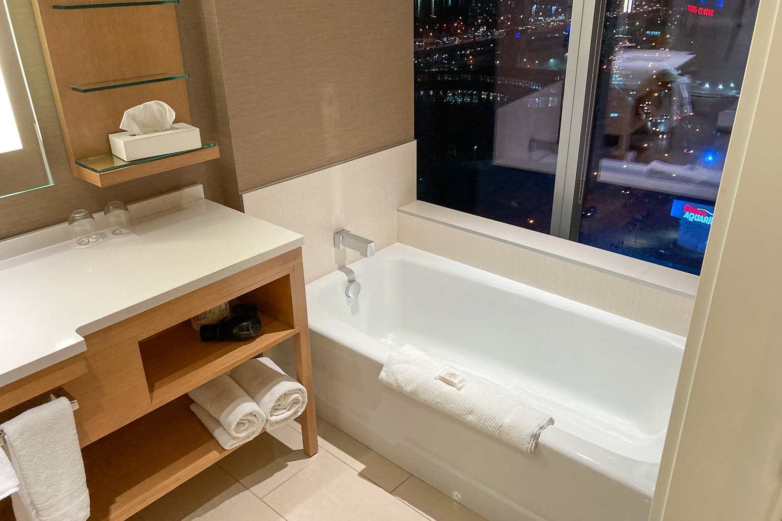 The bathroom was well-appointed, if lacking the grand exposure of the corner room, which honestly wasn’t the worst thing. There’s no soaker tub, but I found an alternate solution, which I’ll mention at the end of this review.
