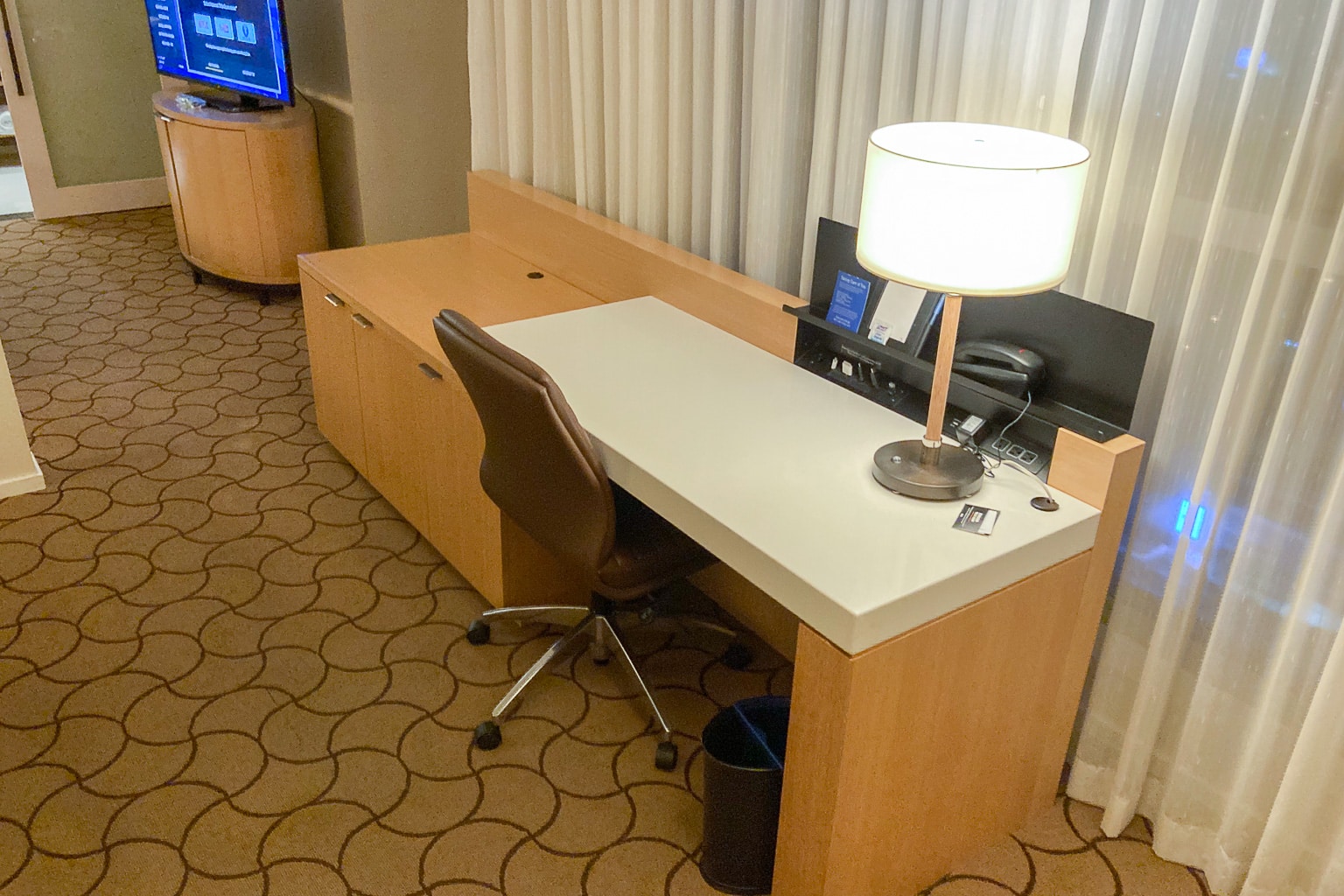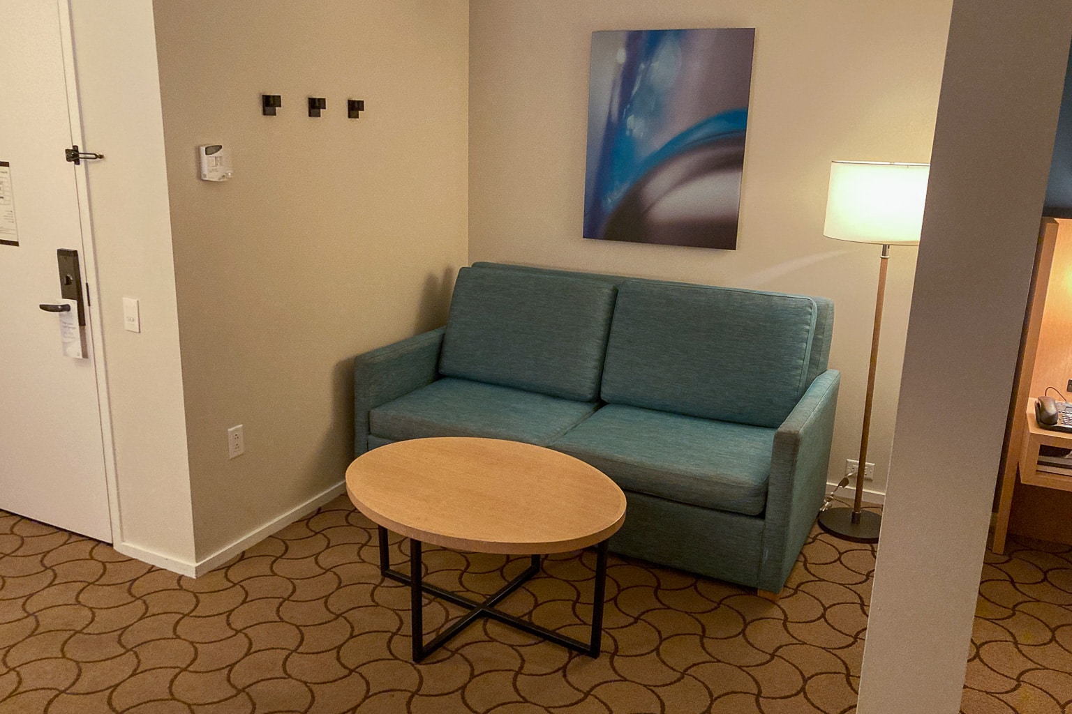 Immediately upon entering the room, there’s a pull-out couch with a coffee table. This constitutes all of the room’s leisure seating, and it was perfectly adequate for a quick team hangout before The Travel Summit’s evening party.