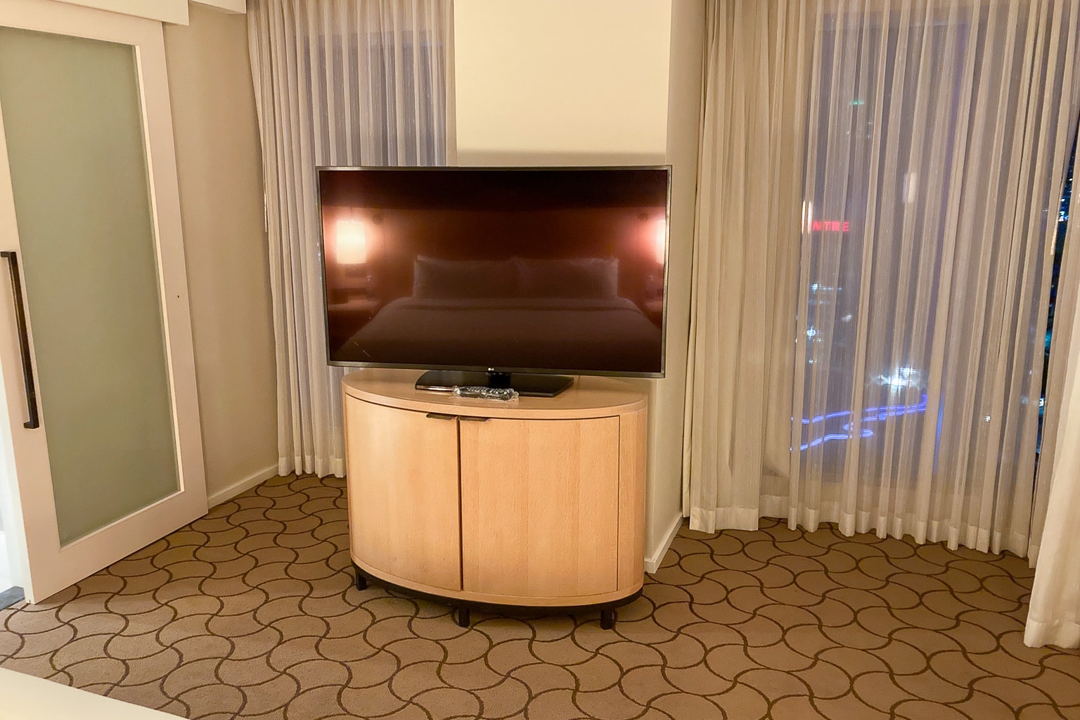 Across from the bed, the TV is perched atop an elliptical cabinet, which houses the room’s mini-fridge.