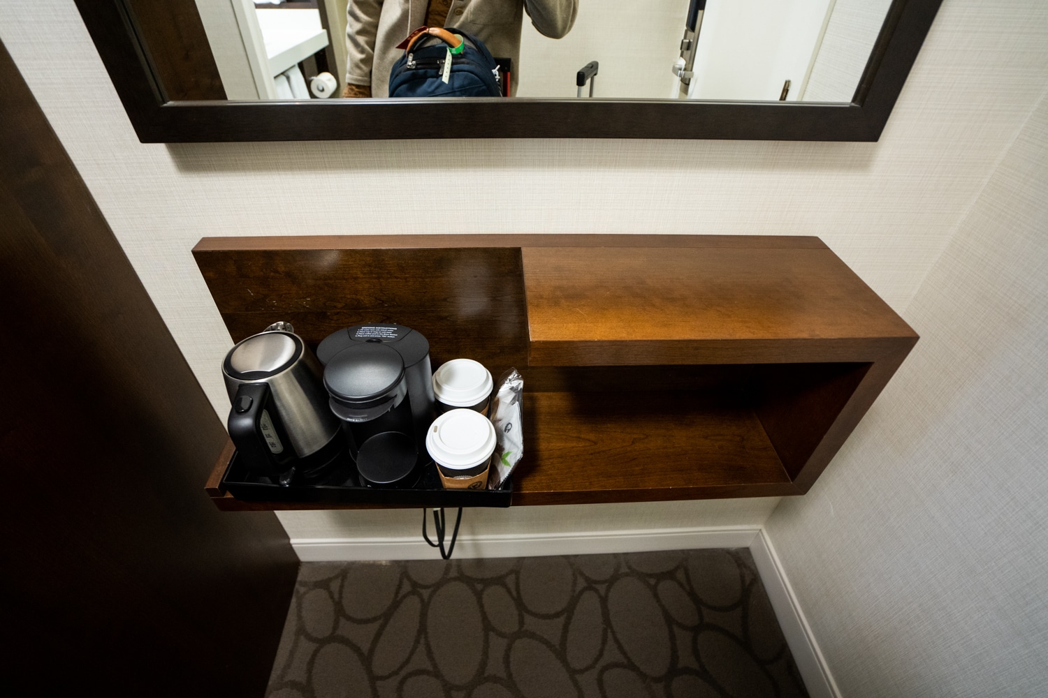 Lastly, there’s a small pantry, where you can find a basic coffee maker and a kettle for tea.