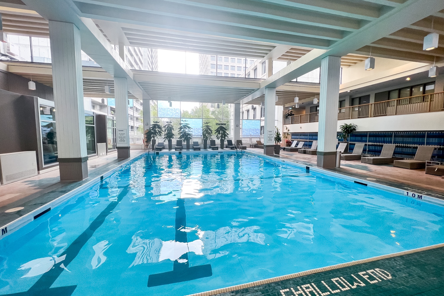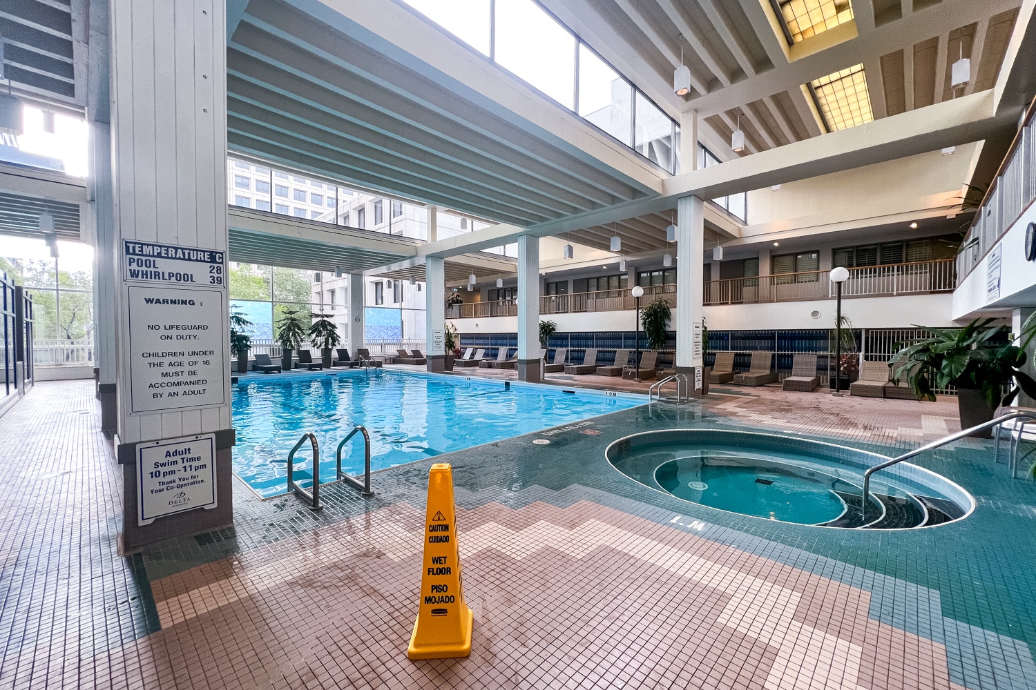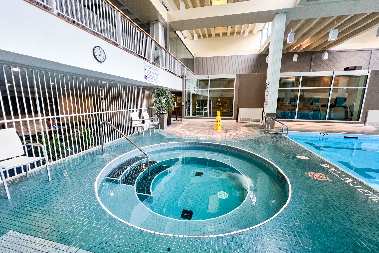 The indoor pool area was spacious, with a large, heated lap pool and then a jacuzzi nearby, as well as plenty of lounge chairs dotted around.