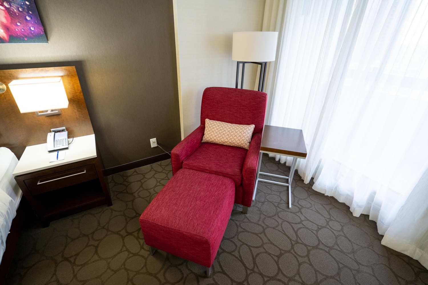 To the right of the king bed is a vibrant red armchair, which had a small side table at its side.