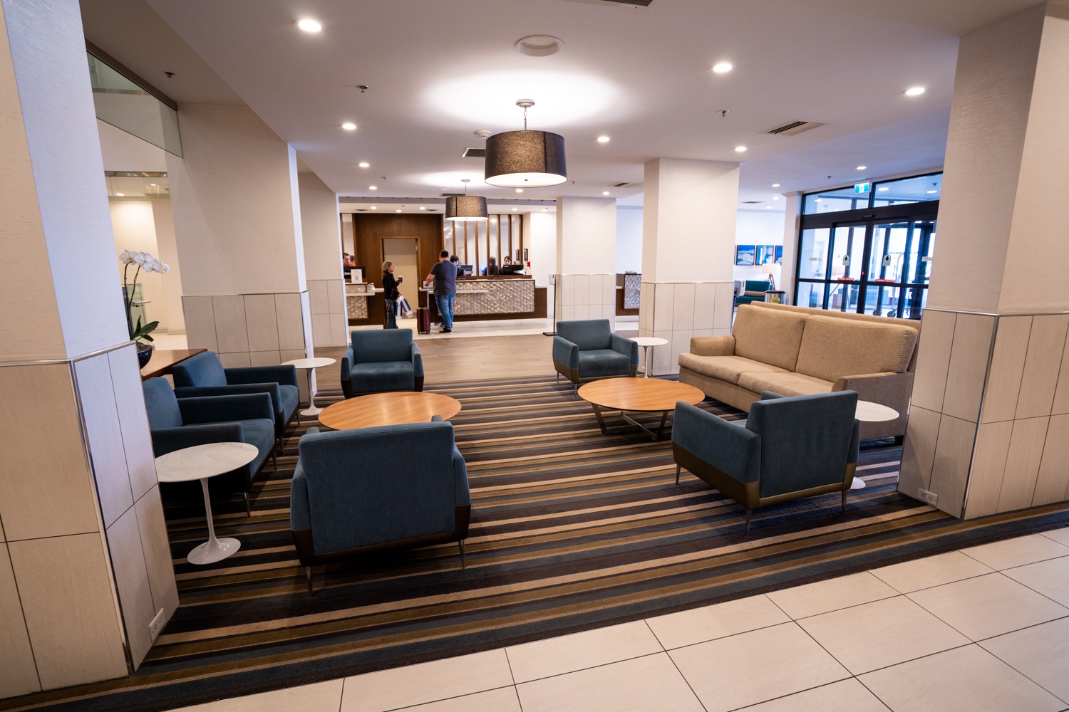 Upon entering the hotel through the ground-level entrance, two check-in desks are immediately to the right, and to the left is a seating area with a single couch and numerous armchairs.