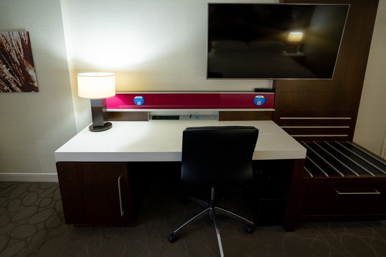The desk was positioned at the wall opposite the bed, and came with an ergonomic swivel chair, which is always appreciated. The desk also had conveniently-placed charging ports, a small lamp, and then a luggage rack to its right.