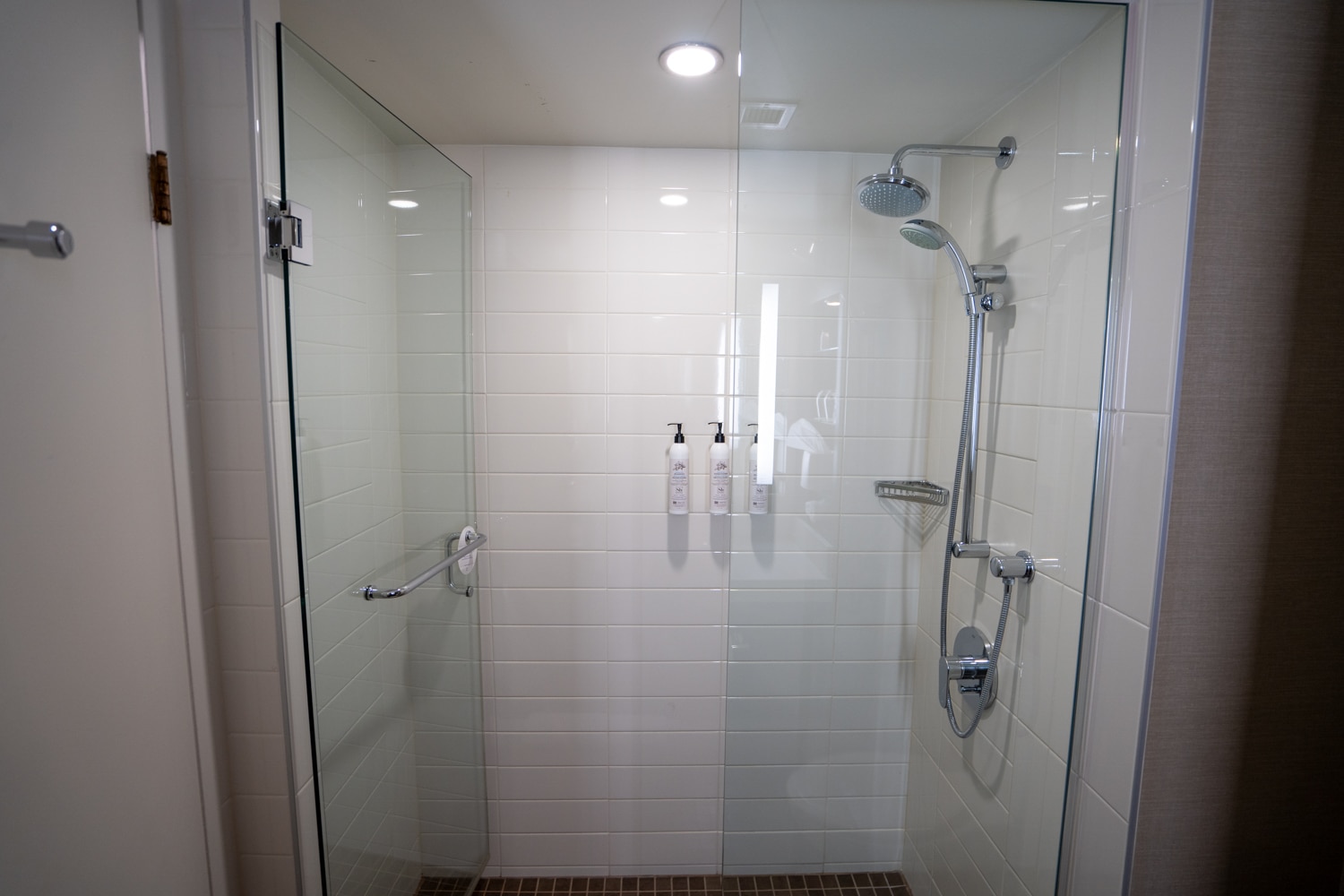 There’s a walk-in shower with bright white tiling, in addition to a modern rain showerhead.