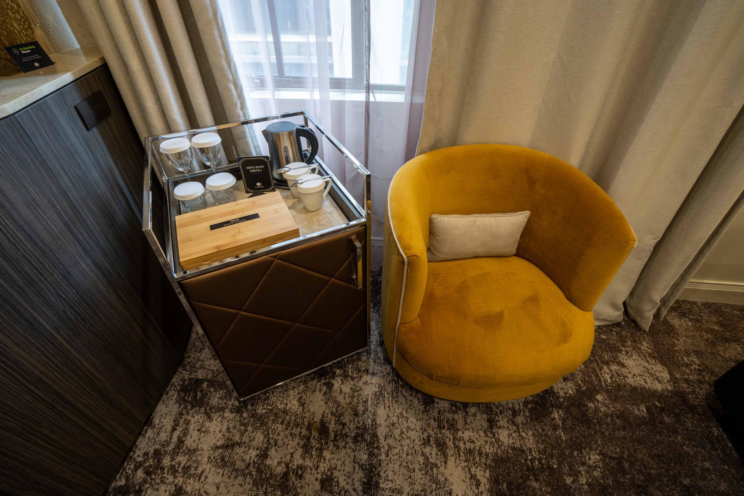 To its left sits a sleek console table, accompanied by a minibar and a plush yellow chair.