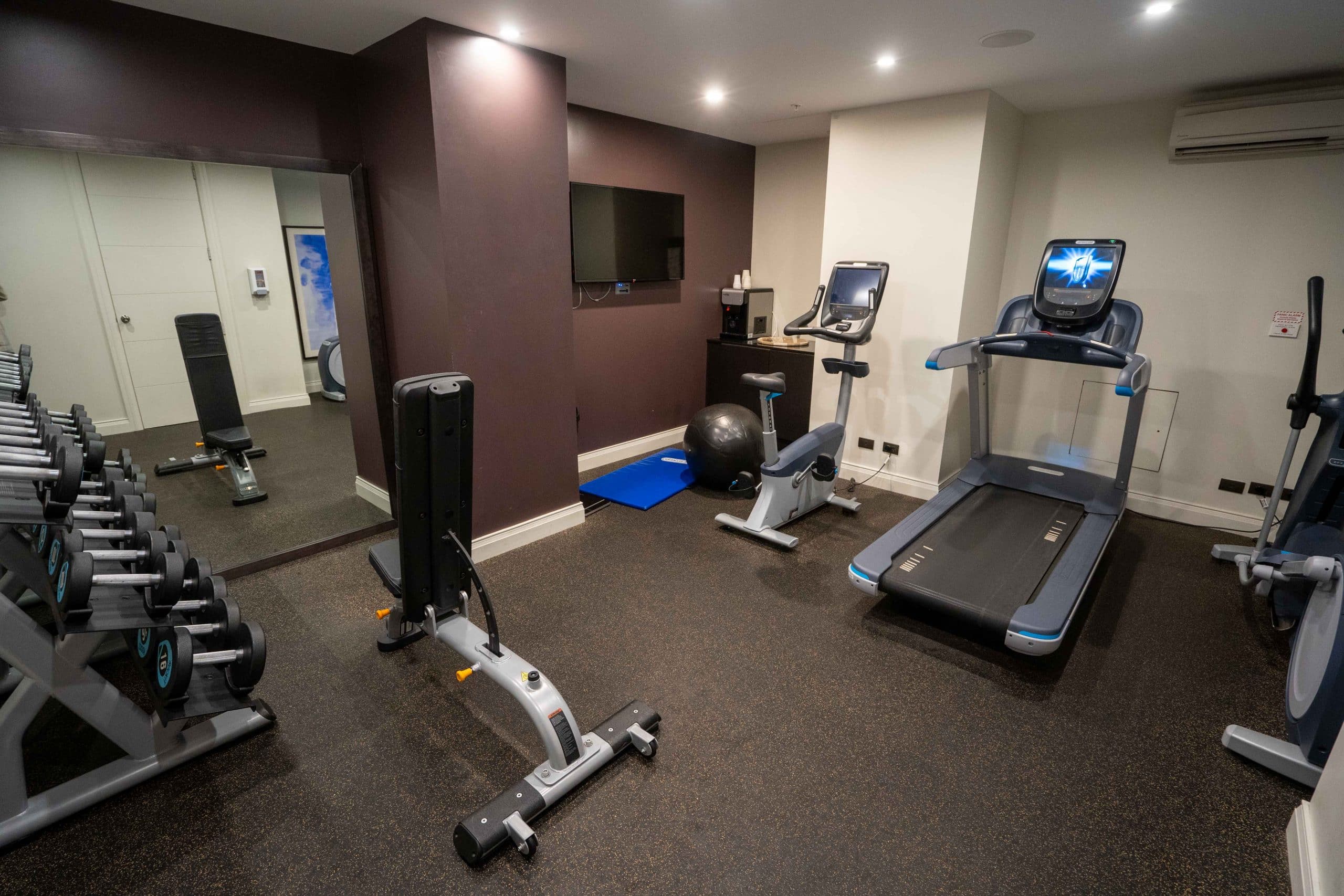 The fitness centre is very small in size, and is equipped with only a handful of machines, free weights, and yoga mats.