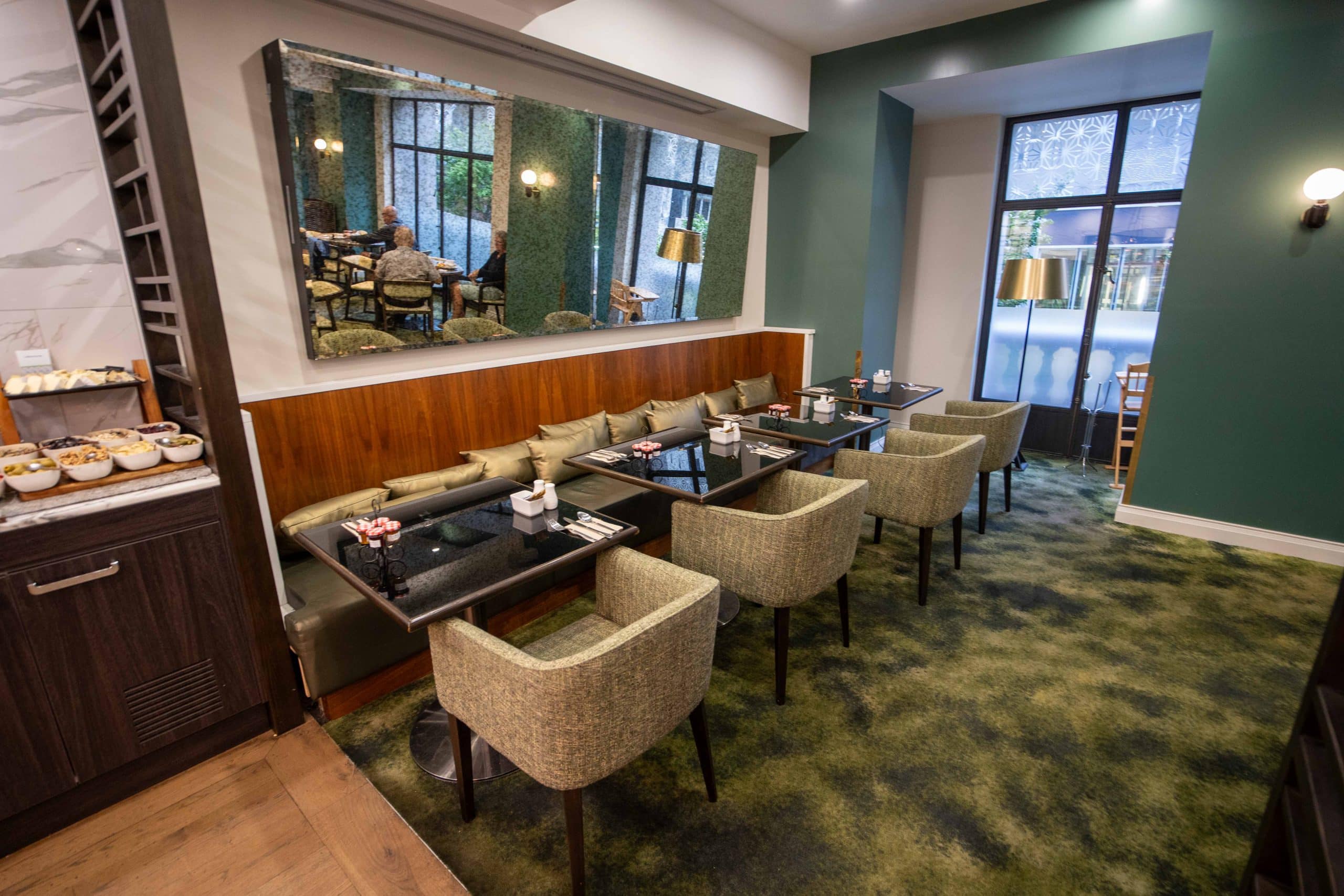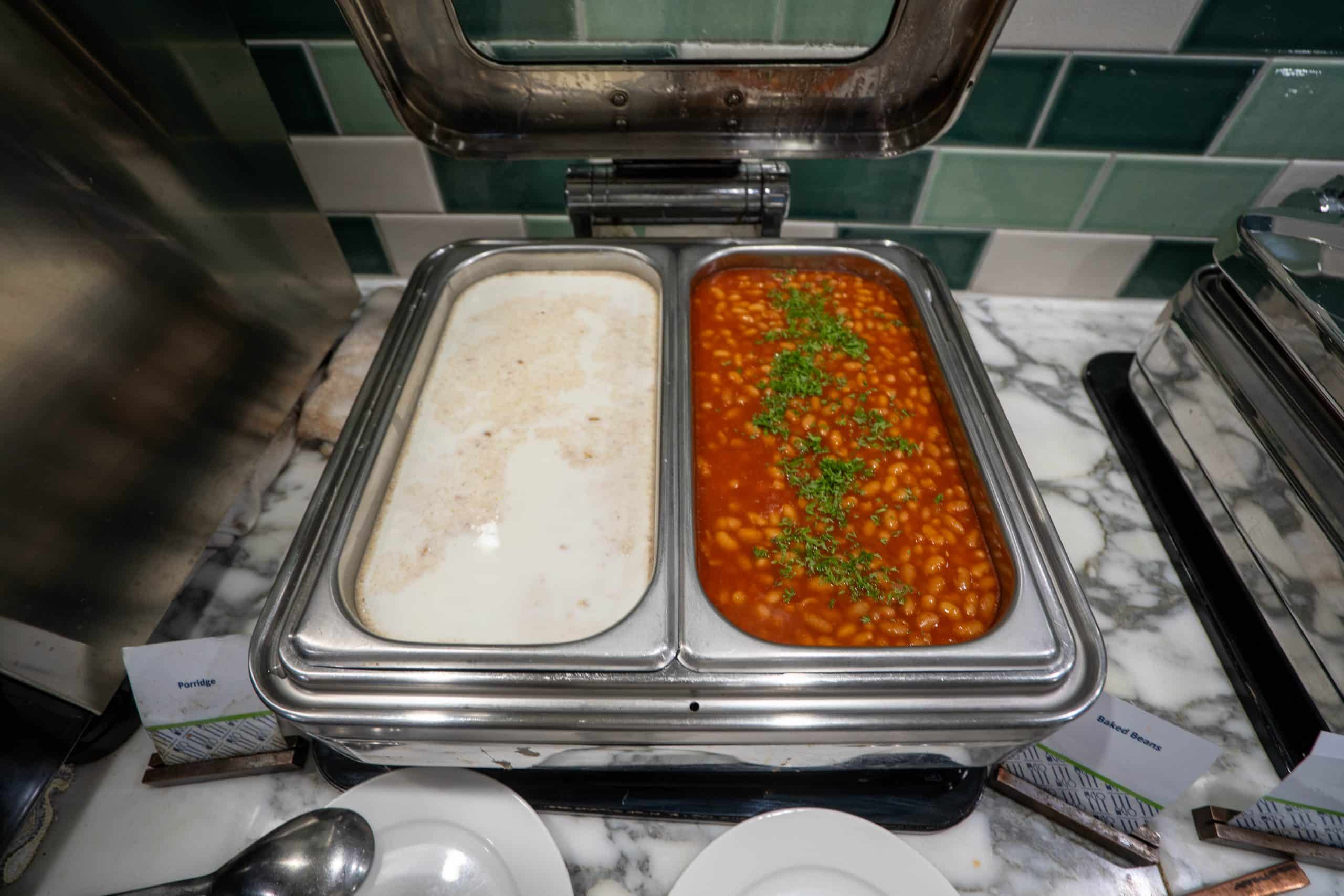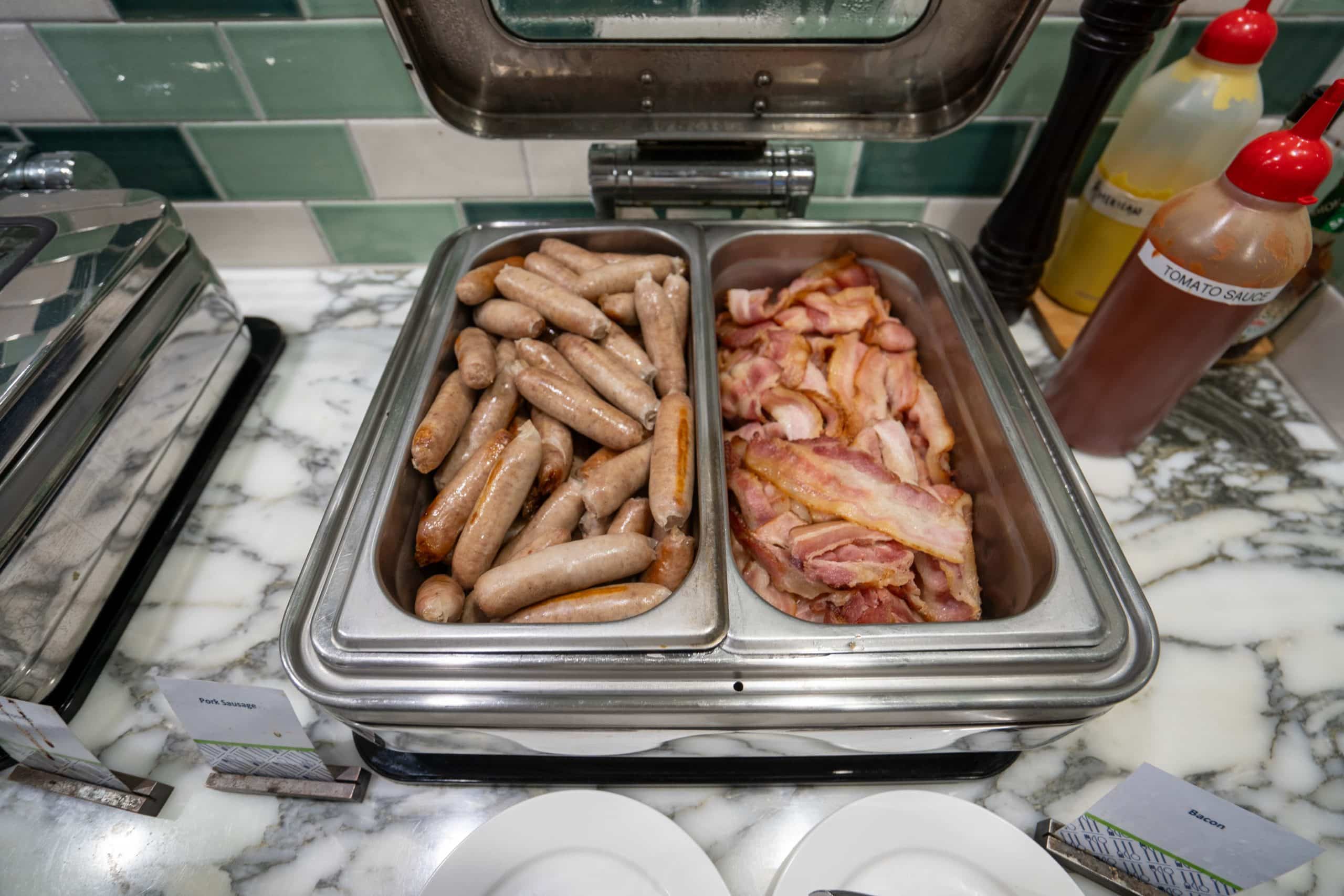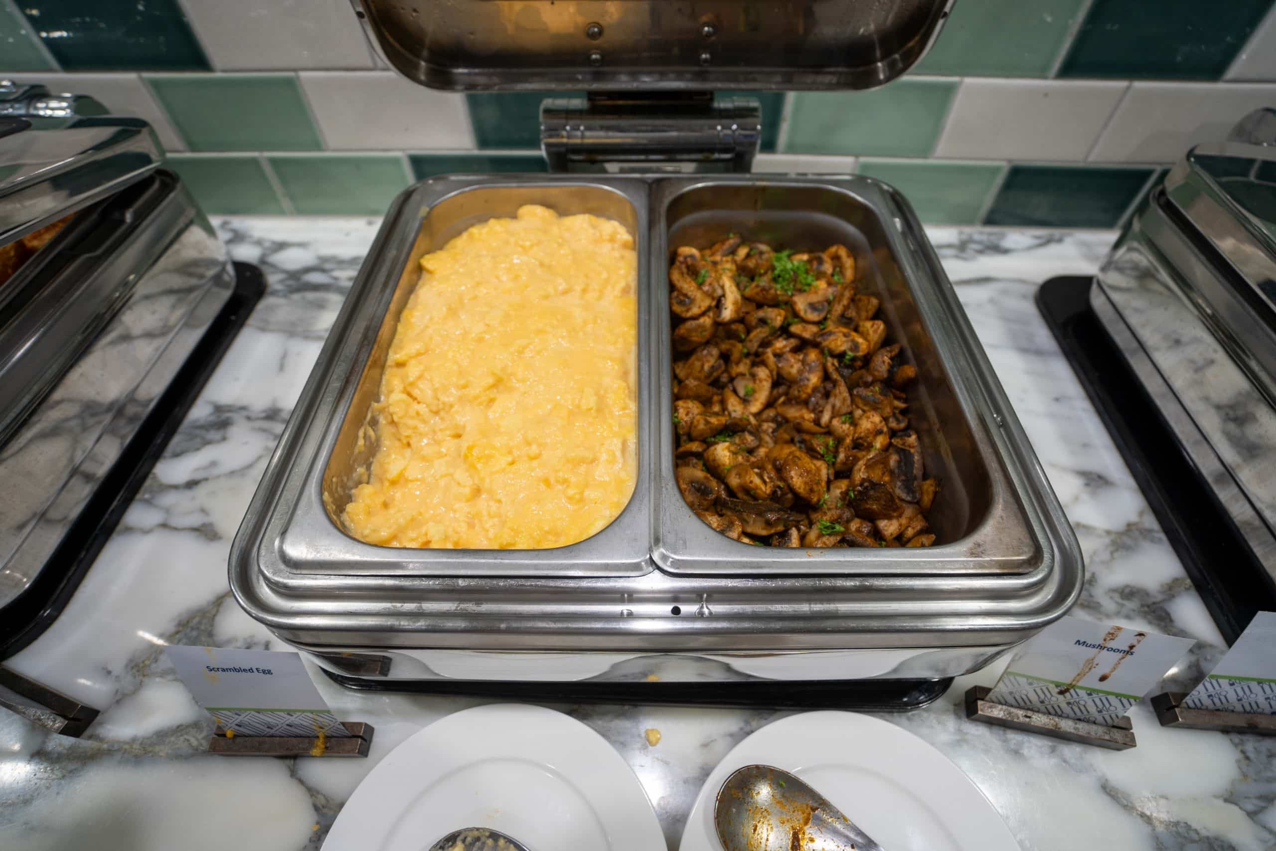 The restaurant has a light buffet spread with hot items such as eggs, bacon, and pancakes, as well as a small selection of cured meats, cheese, fruits, and pastries.