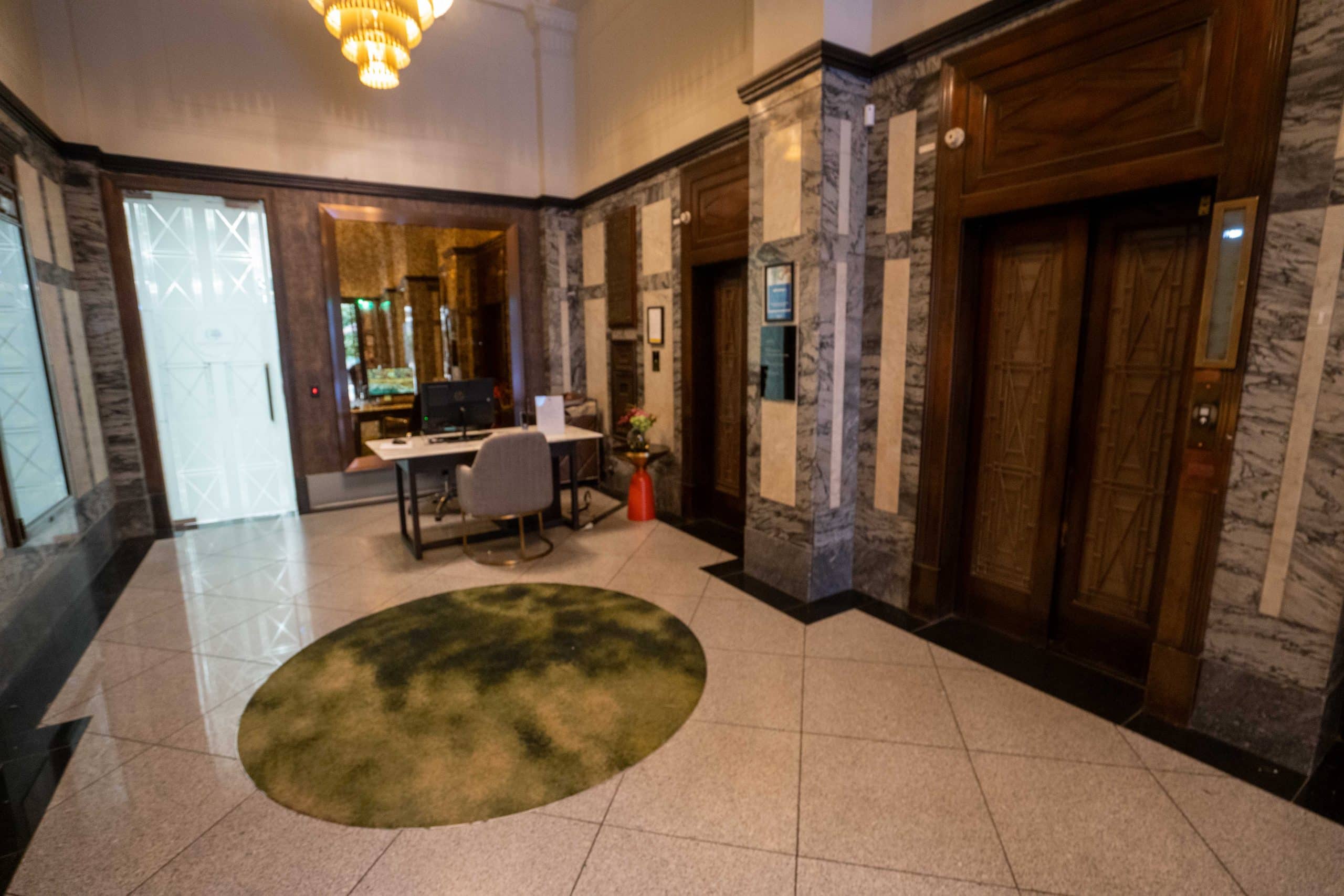 Once you step into the hotel’s lobby, you’ll find a narrow space laden with black-and-white marble, distressed copper mirrors, and period elevators.