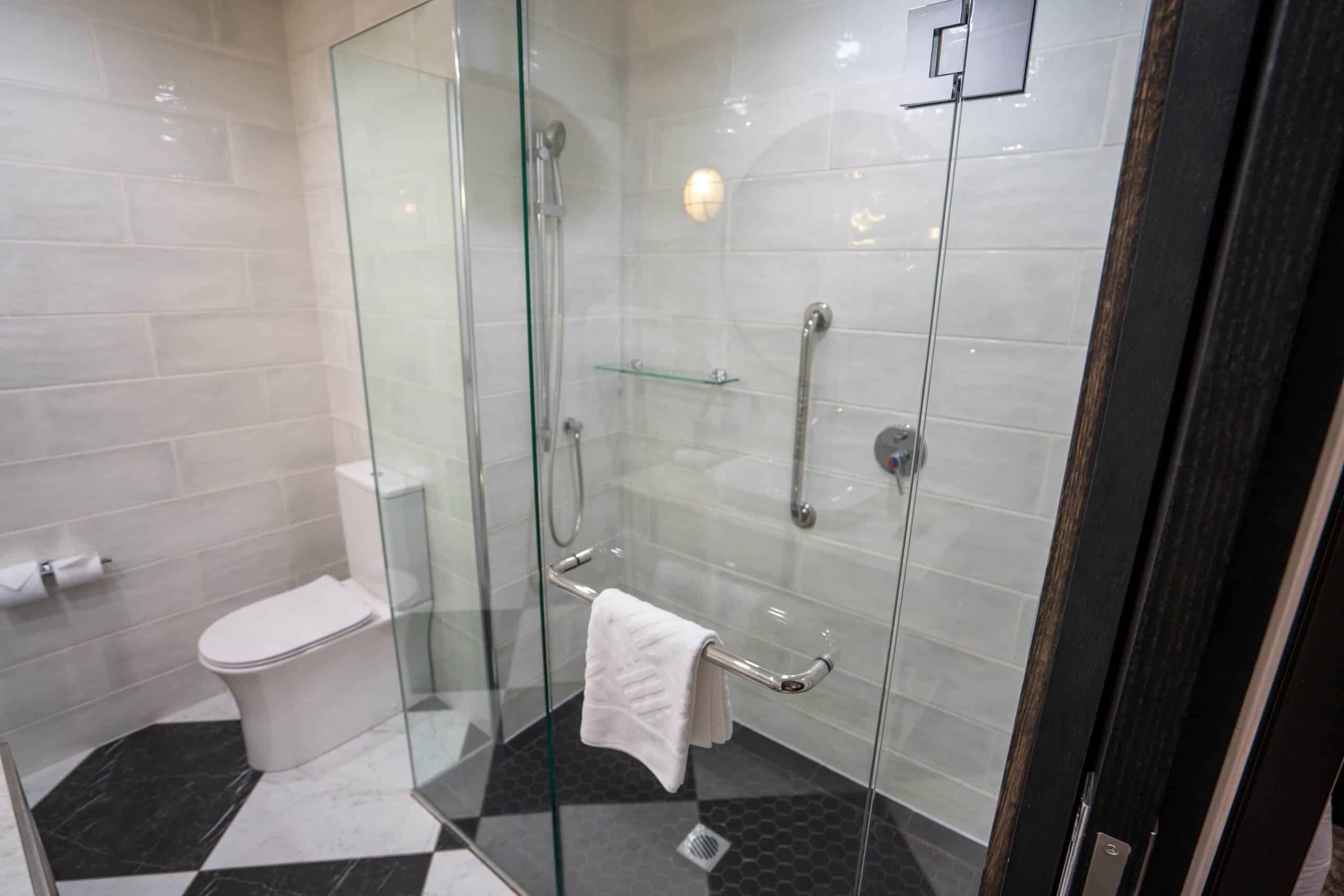 Moving on to the bathroom, it has a contemporary design and meets the expected standards. There’s a single vanity, a spacious walk-in shower, and a toilet.