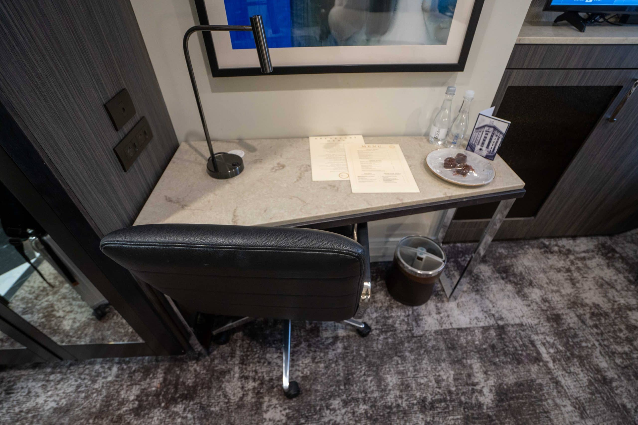 Conveniently positioned nearby is a small marble-topped desk with an ergonomic chair, which is ideal for any work-related tasks.