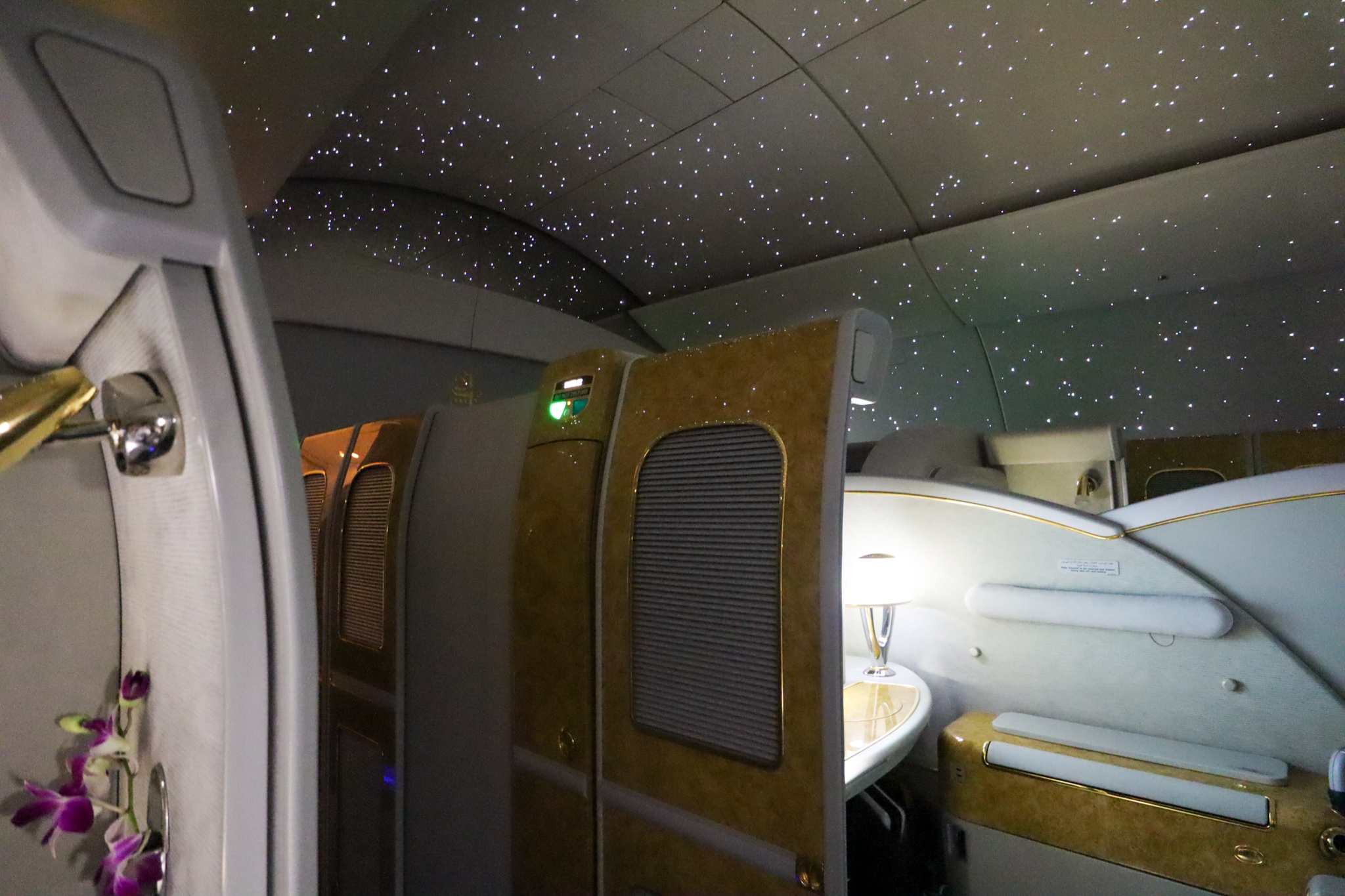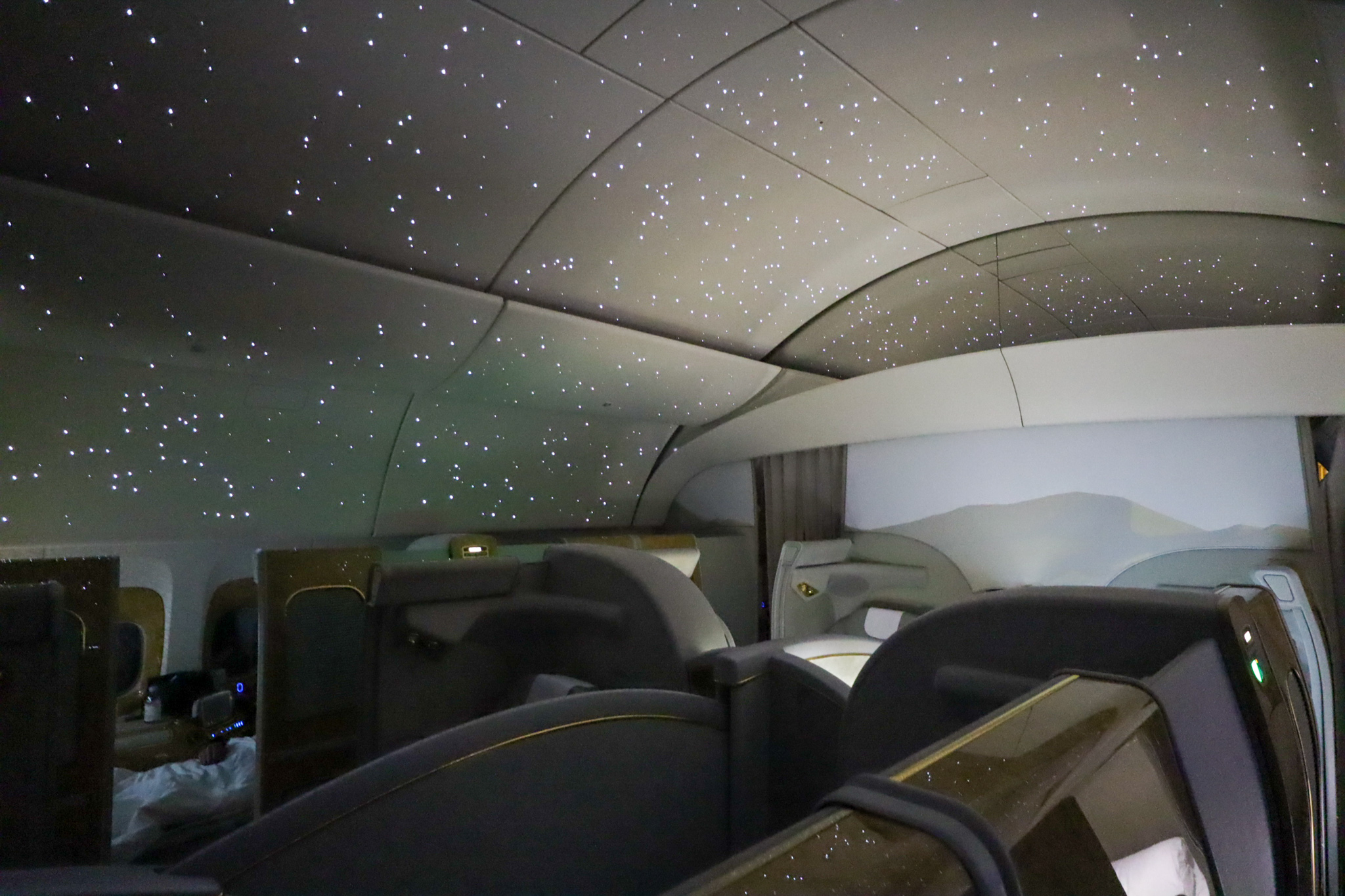 With no floor-to-ceiling enclosed suite this time, my frame of view was instead filled with a gorgeous starry-night pattern that Emirates casts on the ceiling in the First Class cabin. I was fast asleep in no time.