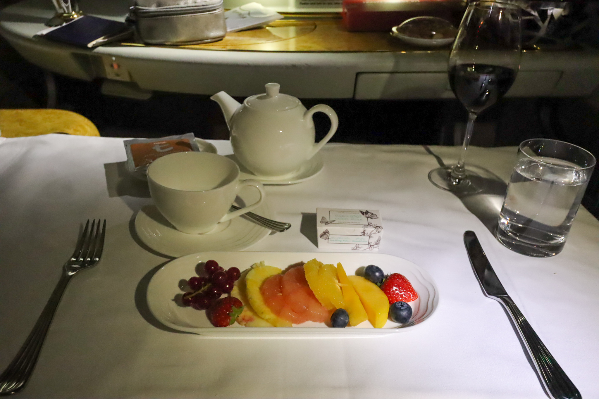 With my mattress and bedsheets prepared in Seat 2A, then, I nibbled away at my fruit plate and green tea…