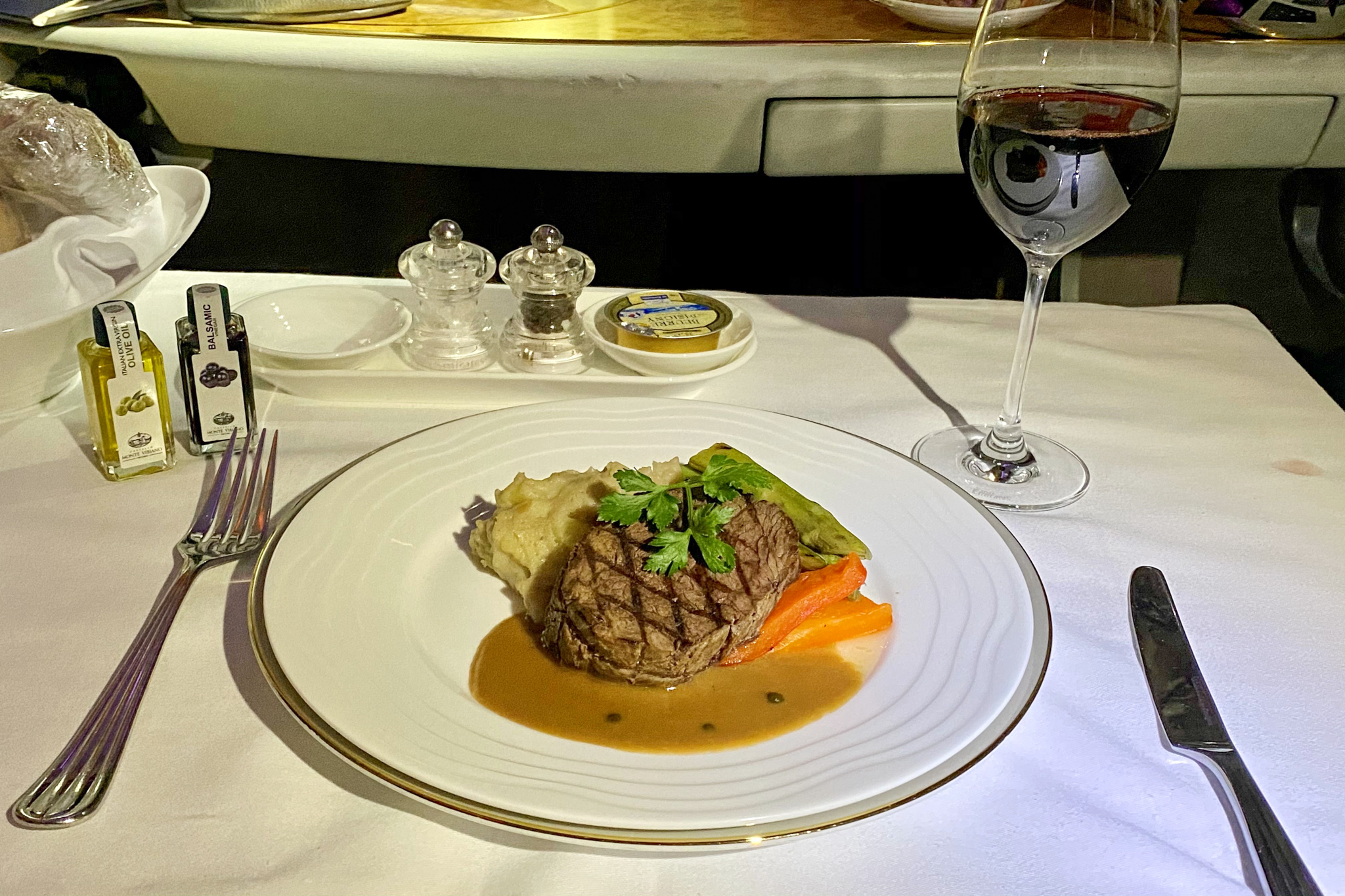 Certainly, it’s tricky to serve a cut of beef in a pressurized cabin that isn’t a little bit on the dry side, but that’s where the peppercorn sauce comes in to balance out the texture.
