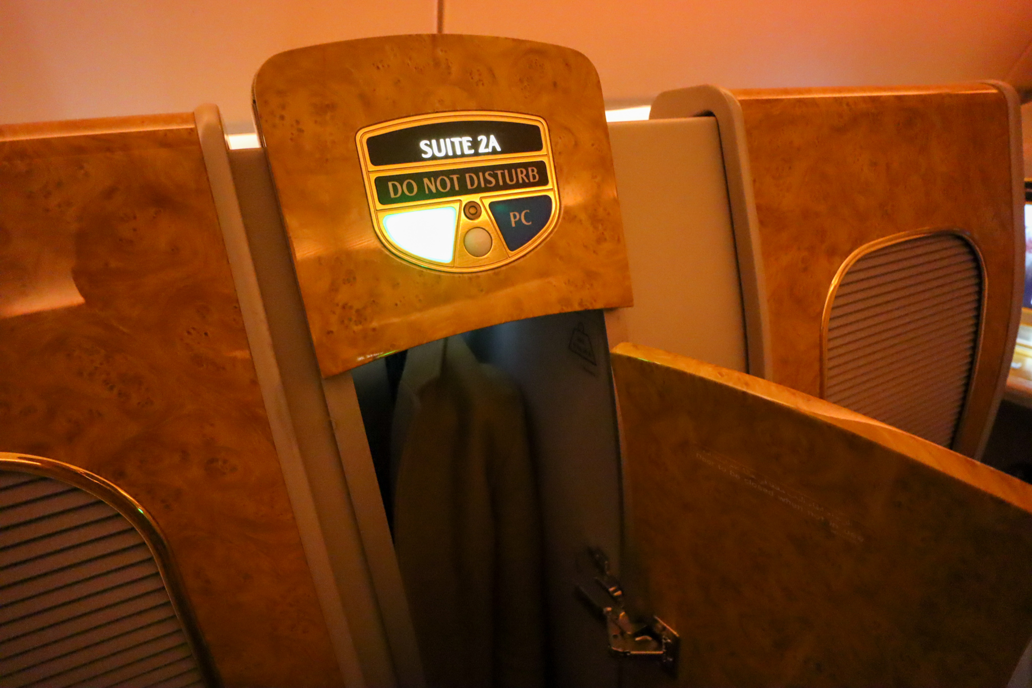 There are additional seat controls on the aisle-side armrest (not photographed), which also allow you to open and close the suite’s doors when they aren’t latched for takeoff and landing. Then, on the actual exterior of the suite, you’ll find your closet for hanging up your street clothes during the flight.