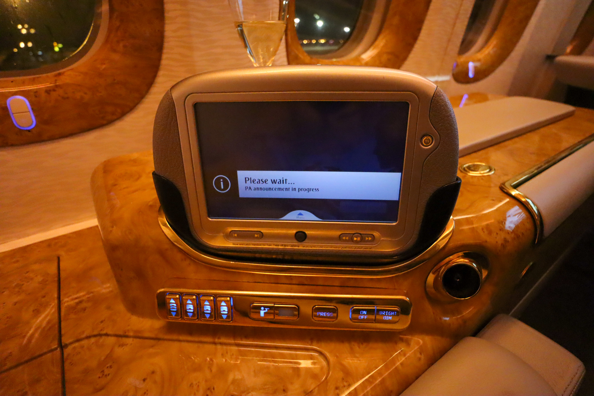 I sat back and relaxed for a bit prior to takeoff, looking out into the aisle and taking note of the fact that this legacy First Class suite was very much older, but no less ostentatious.