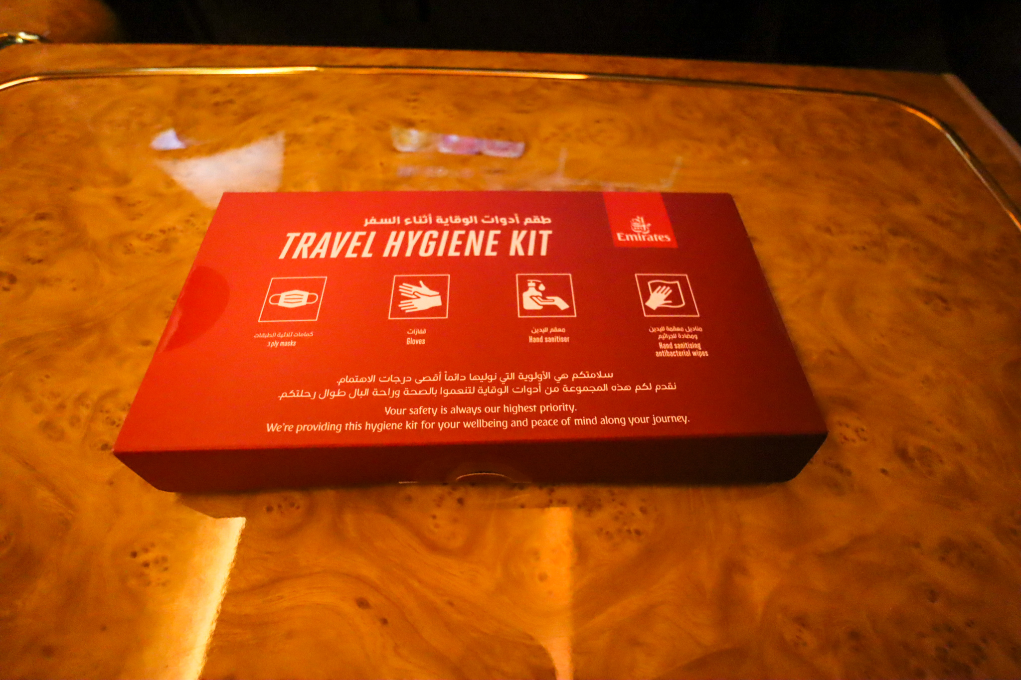 What has changed on these flights in November 2020, however, is the presence of a Travel Hygiene Kit on all Emirates flights.