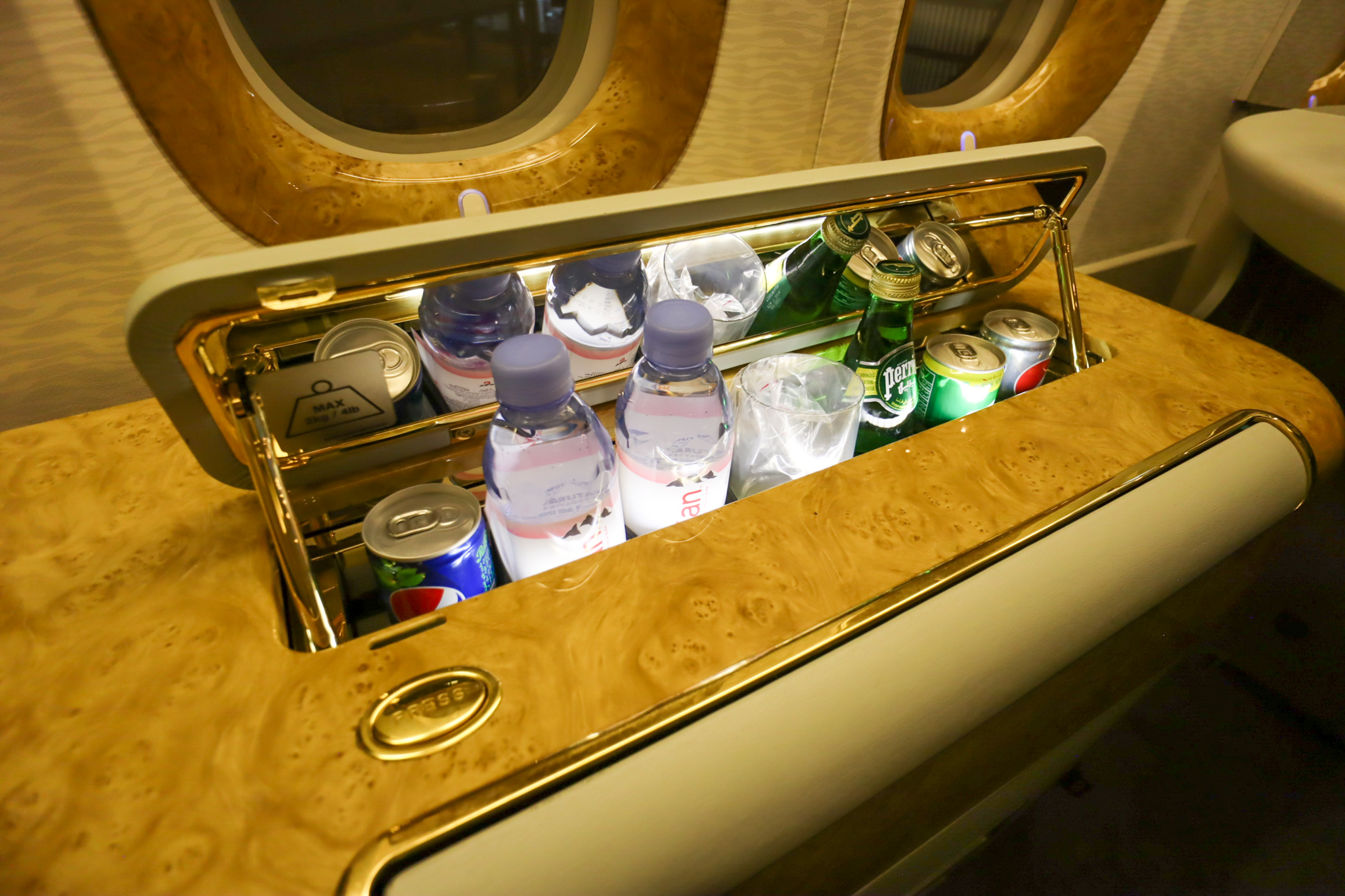 Moving along the side of the suite, we then arrive at one of the timeless Emirates First Class features: the in-suite minibar, which can be raised or lowered with the push of a button. The glass sitting in the middle of the minibar was wrapped in plastic as another precautionary measure.