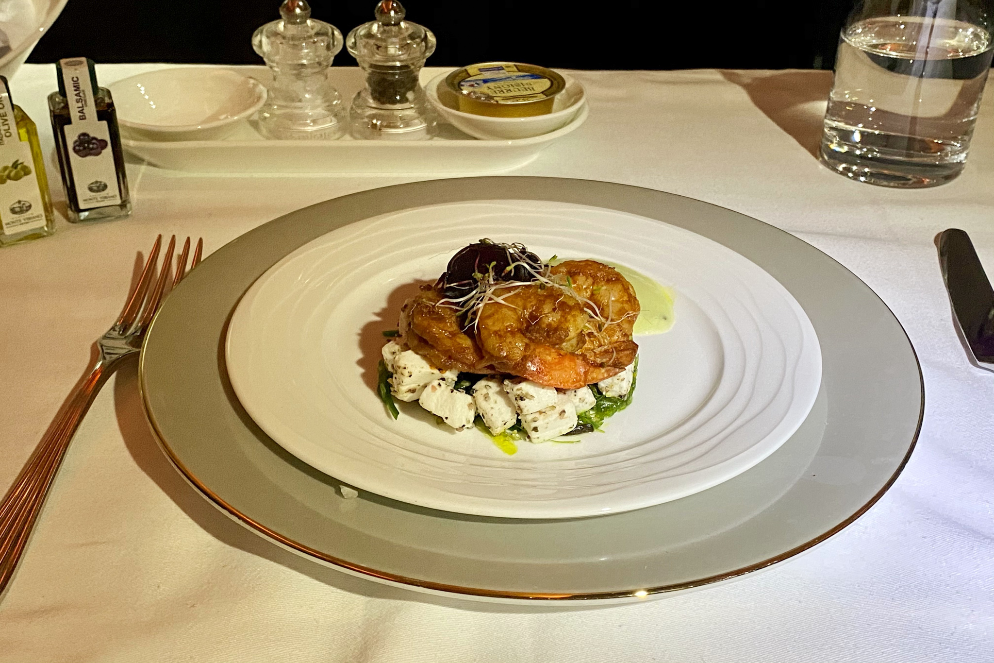 Next up was the appetizer of seared prawns with wakame salad and goat cheese – a pretty typical East–West fusion dish.