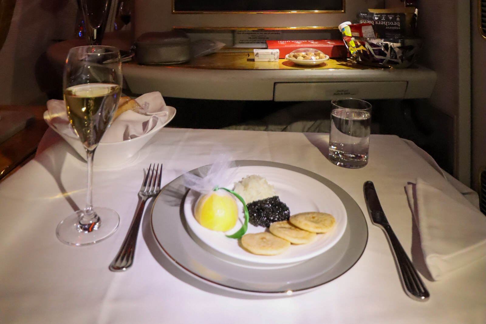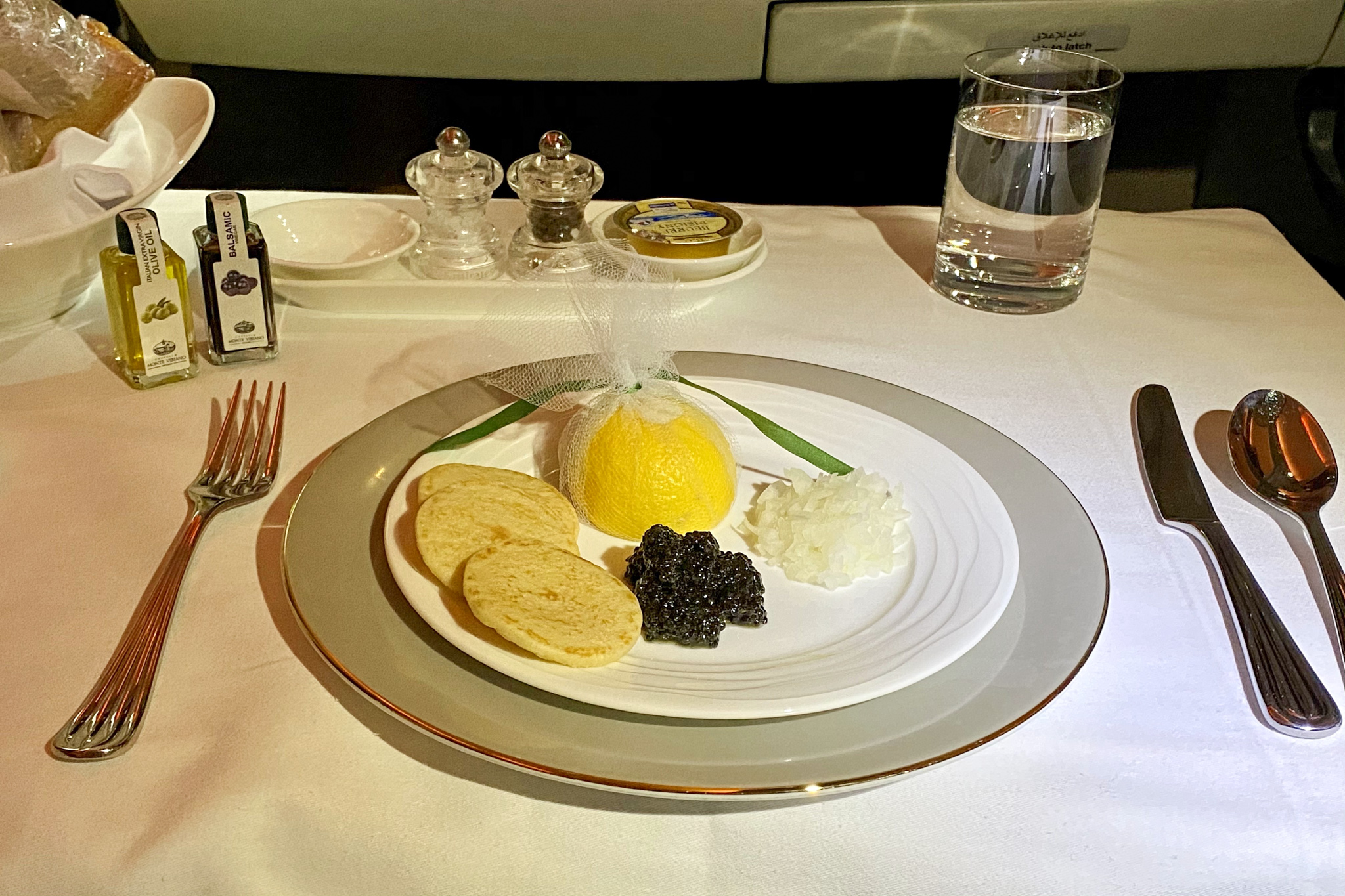Emirates normally serves caviar with a wide range of trimmings on the side: egg yolks, egg whites, chopped onion, crème fraîche, and lemon juice, along with the usual blinis and toasted bread crisps.