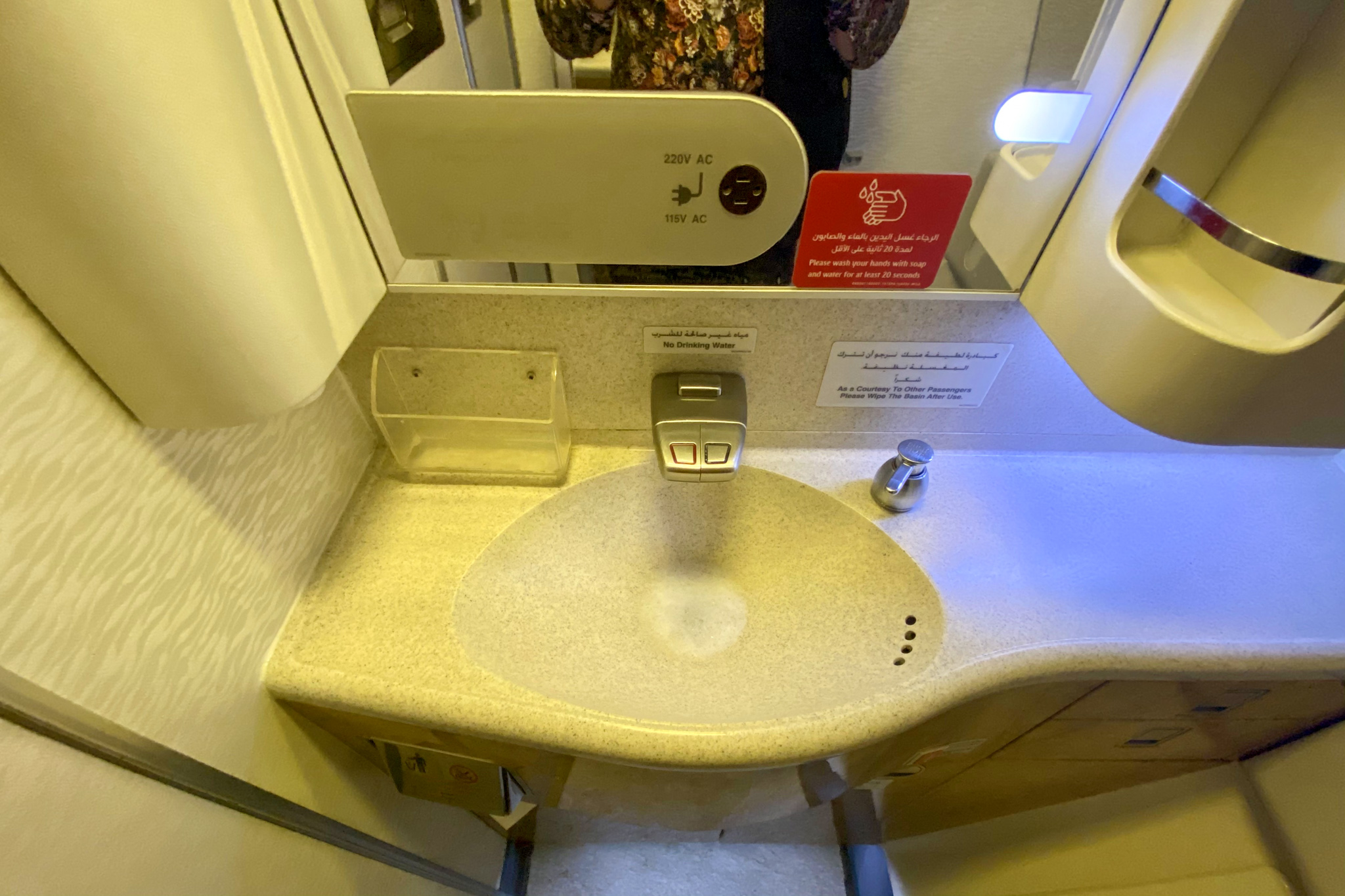 Given the extent to which Emirates has been offering in-flight service close to the pre-pandemic standards, I was a little surprised to see that the in-restroom amenities, like the soft towels or Bulgari cologne, were absent.