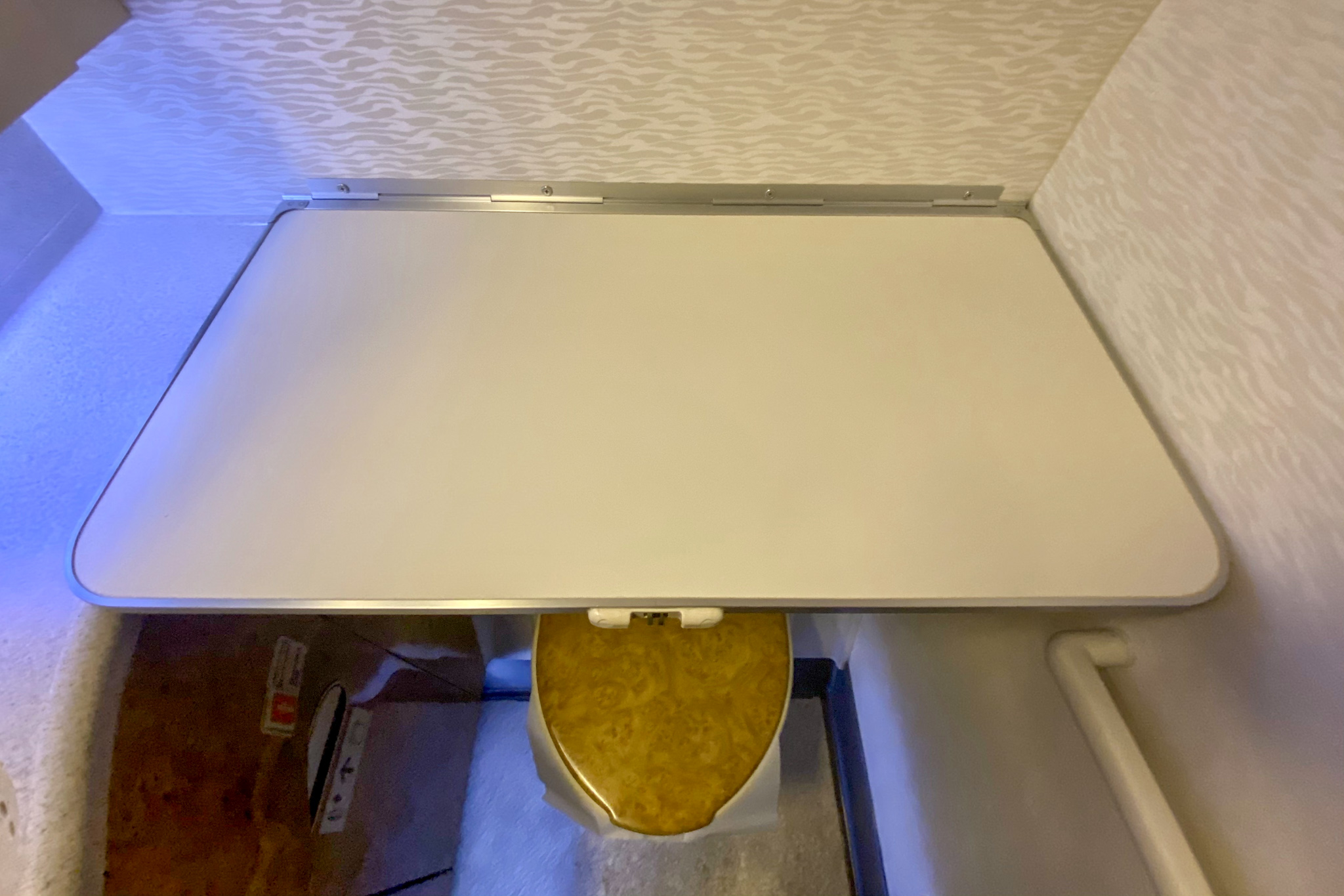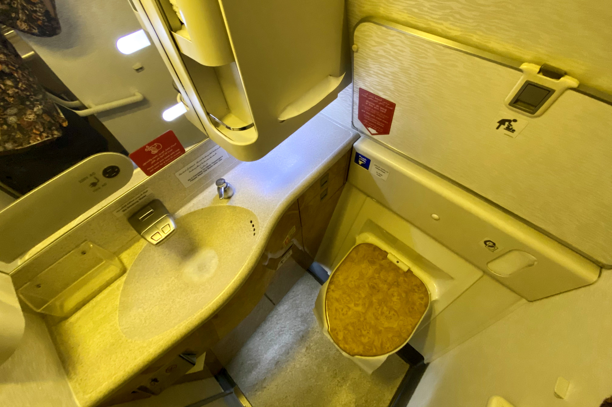 Similar to the rest of the cabin, the restrooms on the older 777 product are a little bit more aged, with the burl wood pattern even making its way in here on the toilet seat.
