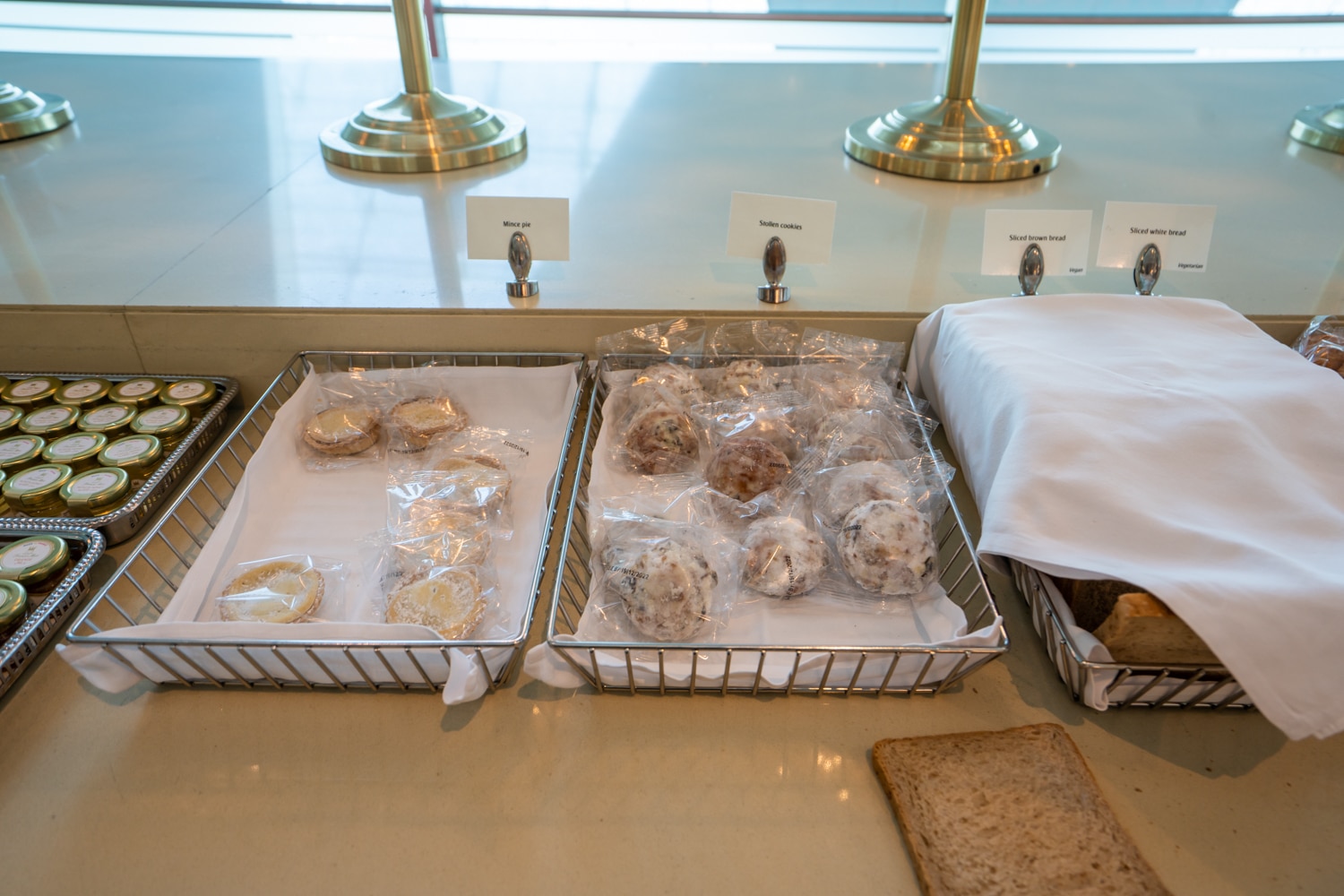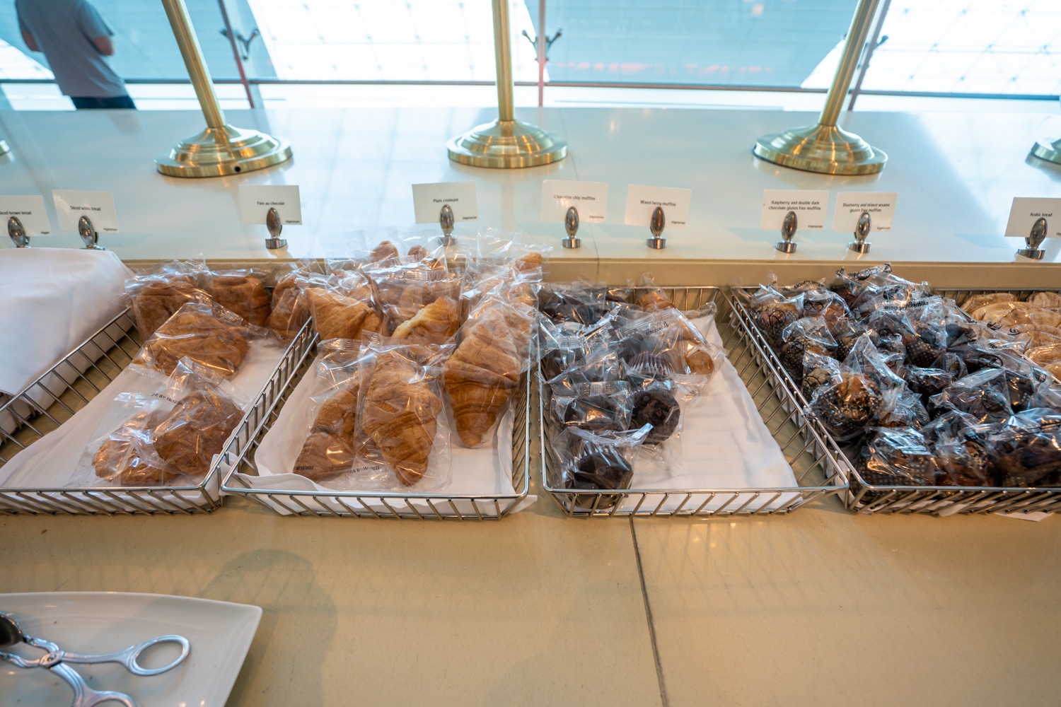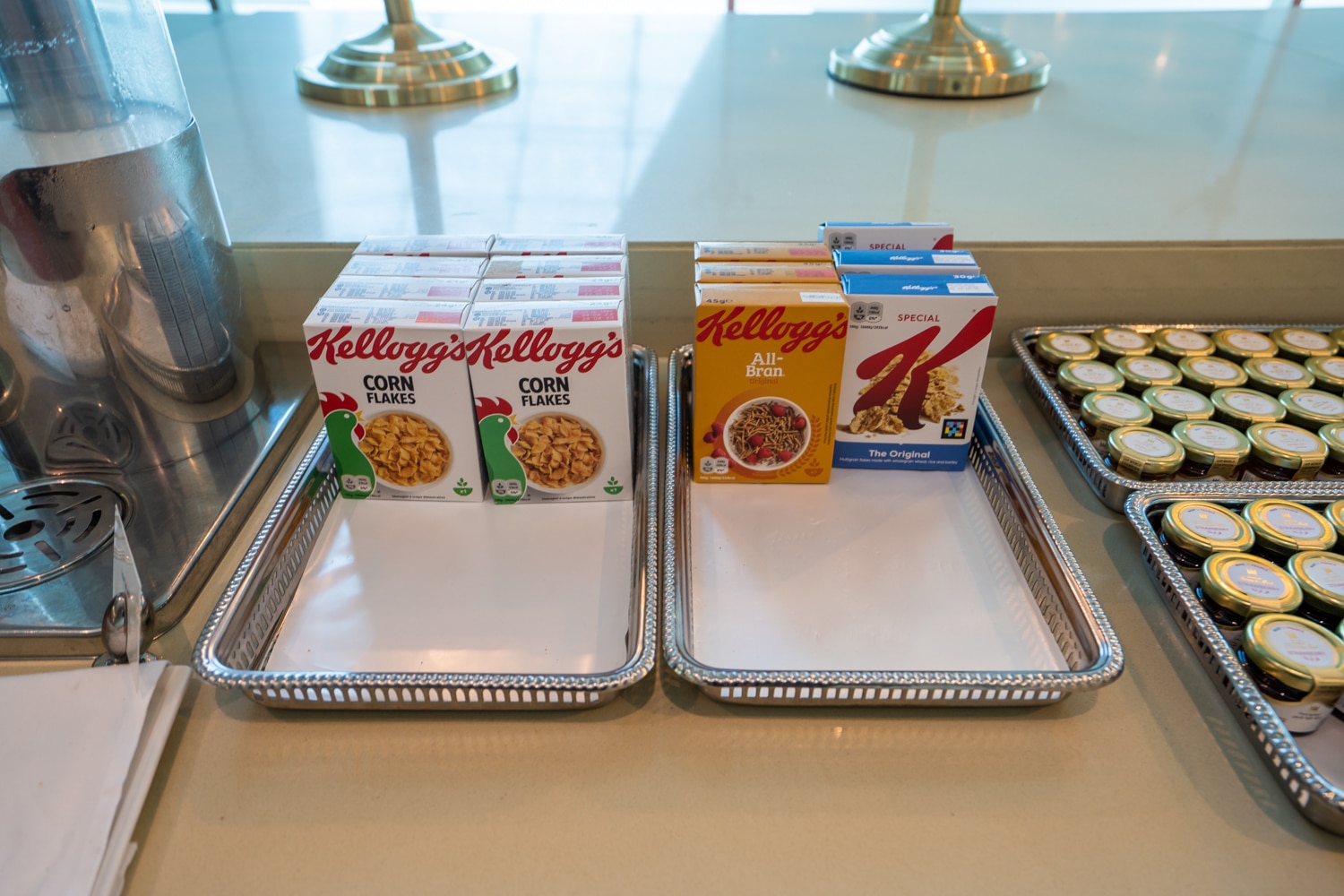 Cold items included individually wrapped sweets and pastries and a station with cereal, as well as yogurts and dips.