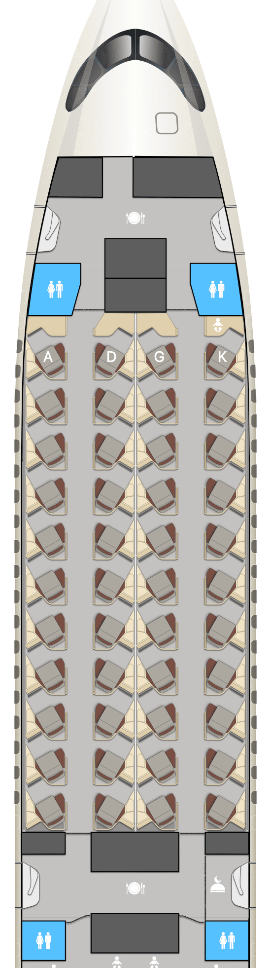 There are 44 business class suites onboard the A350-1000, arranged in a 1-2-1 standard reverse herringbone seating configuration, each with direct aisle access. Note that the row numbering begins with 5 instead of 1.