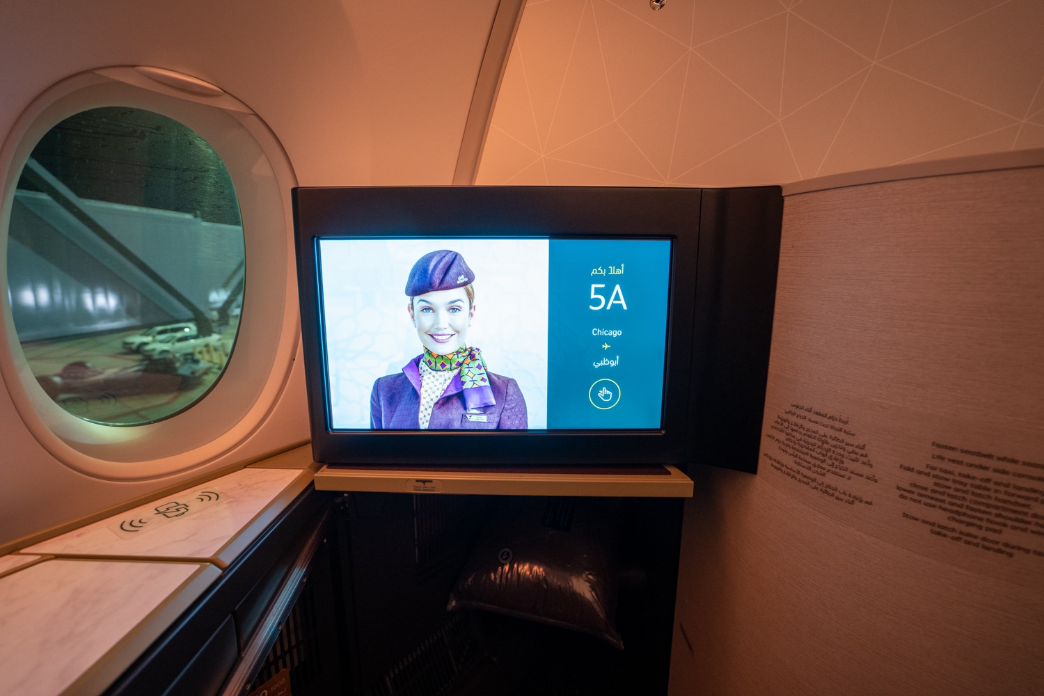 The seat was equally as opulent as the cabin, adorned with faux marble consoles, brown leather armrests, and an Etihad Airways mosaic throw pillow on the seat. In the corner of the seat is a distinct Etihad Airways lamp, which mimics light passing through a palm tree.