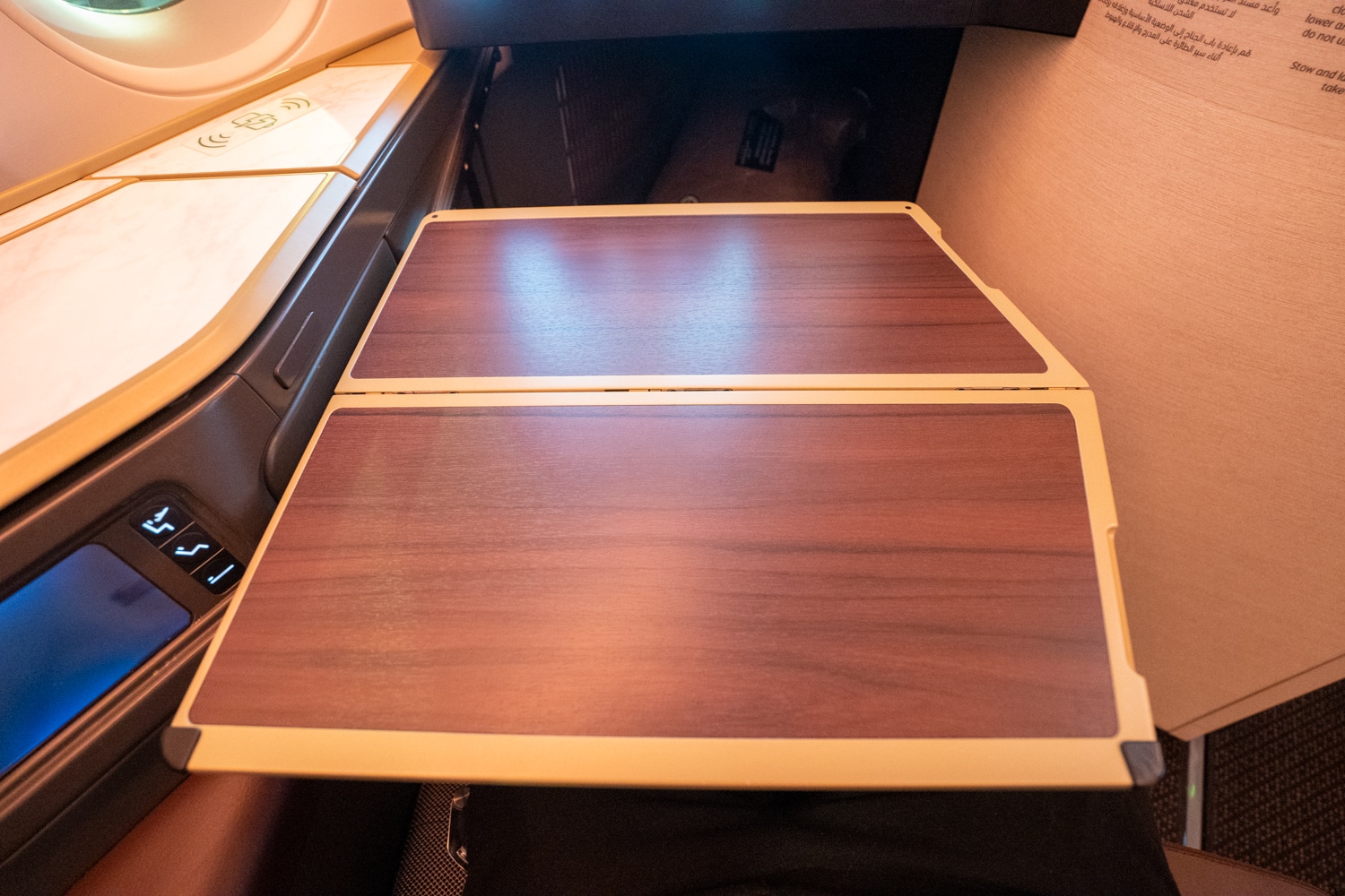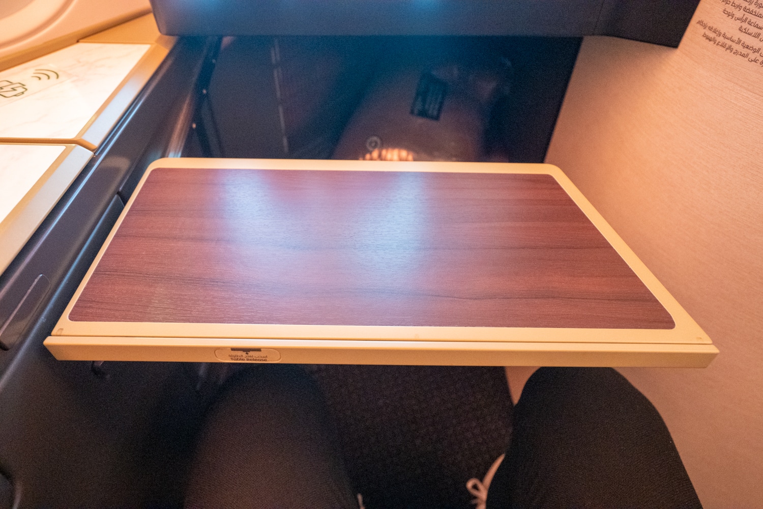 Below the entertainment screen is a sturdy wood-veneered tray table. Underneath is a latch that allows the tray table to slide towards you, and then it can be folded out again to reach its full size.