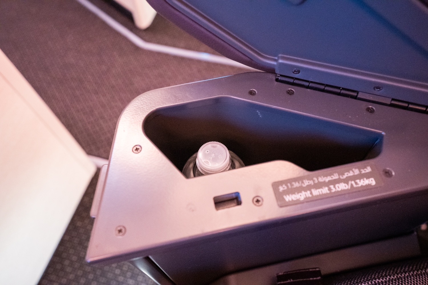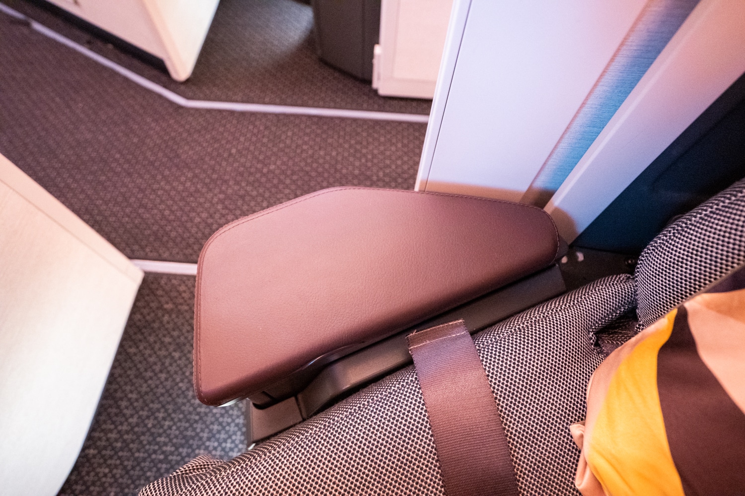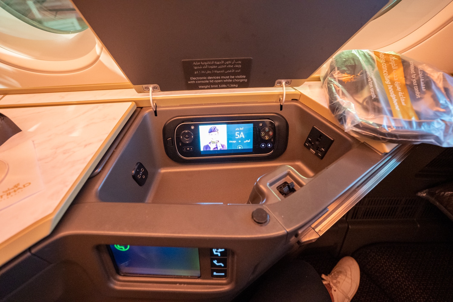 To the left is the seat console, which has a modest amount of surface space and a series of storage compartments. The centre of the console opens up to reveal a deep storage space with a power outlet and the in-flight entertainment remote, which can be withdrawn from its place.
