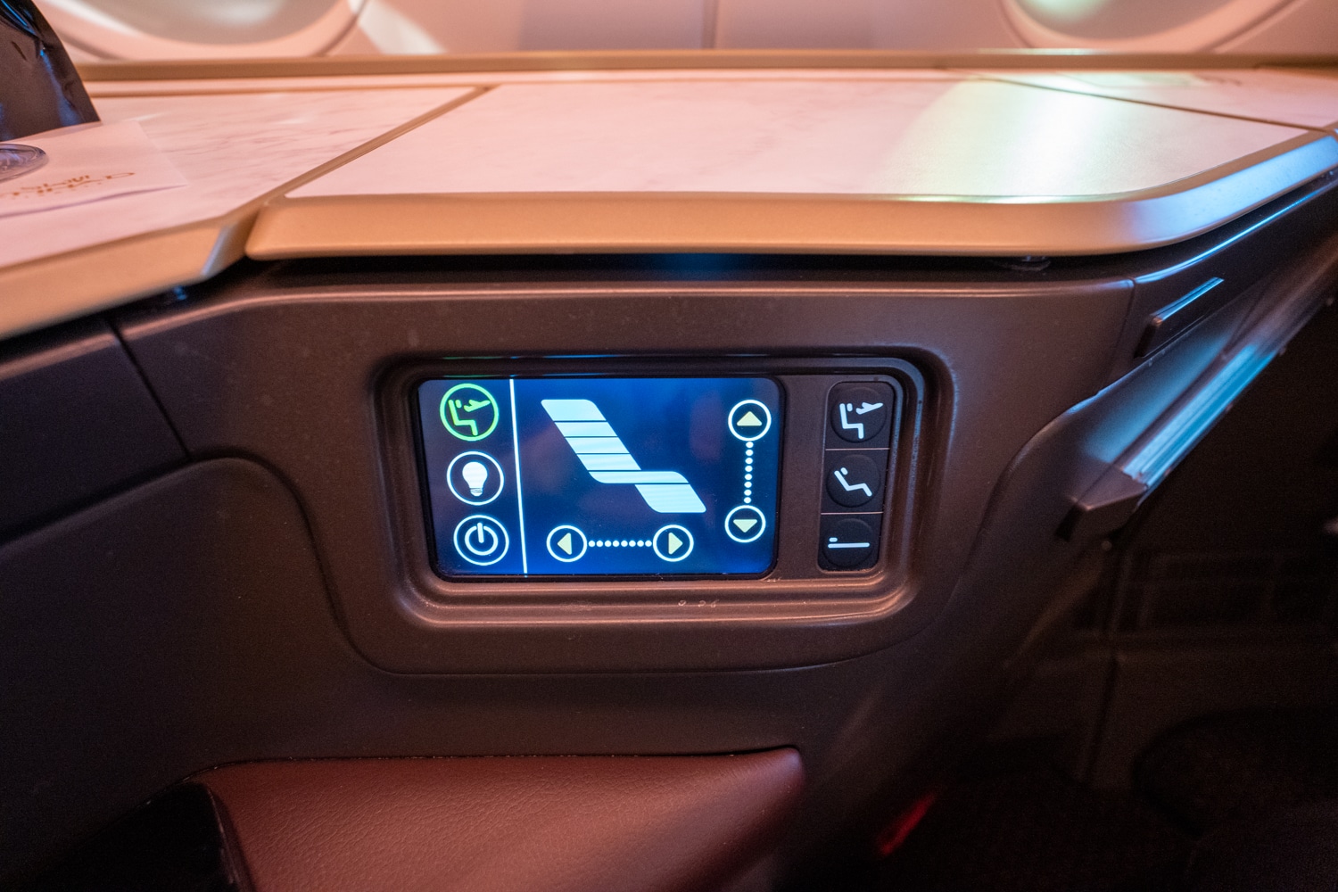 The seat controls are just below the console, well within reach of your fingertips. There are three pre-set analog functions, or you can customize the seat recline, seat angle, and overhead light via the touch-screen.