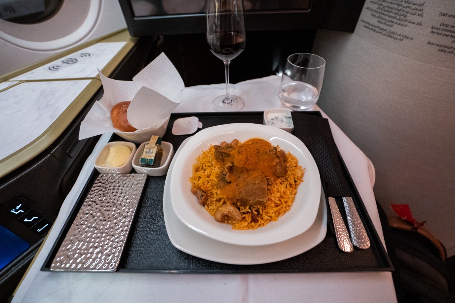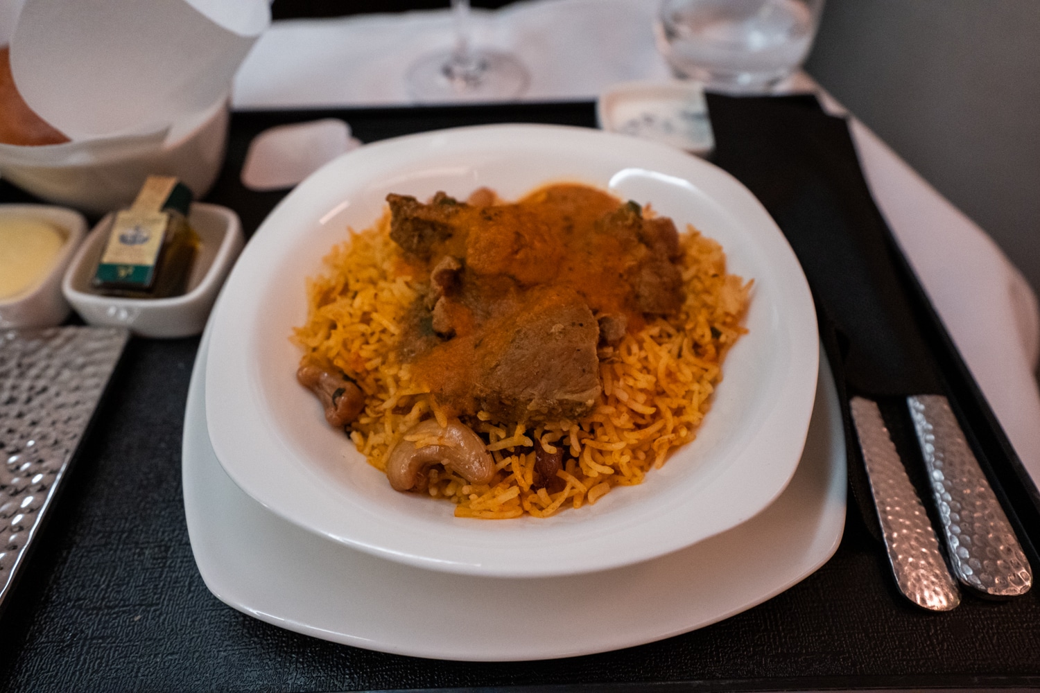 As takeoff approached, a crew member stopped by to take my meal orders for the flight. There were to be three courses, and I selected the lamb makhdous for the main event.
