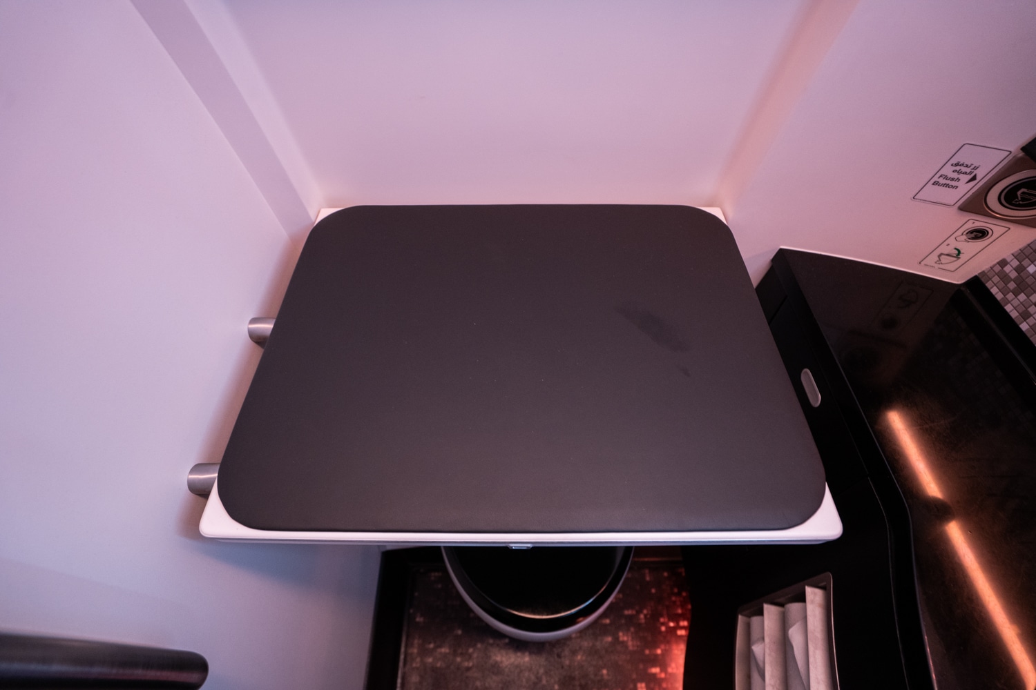 The restroom was rather tight, but has sleek jet-black finishes. A table folds out over the toilet, should you need to rest your belongings on it while you freshen up.