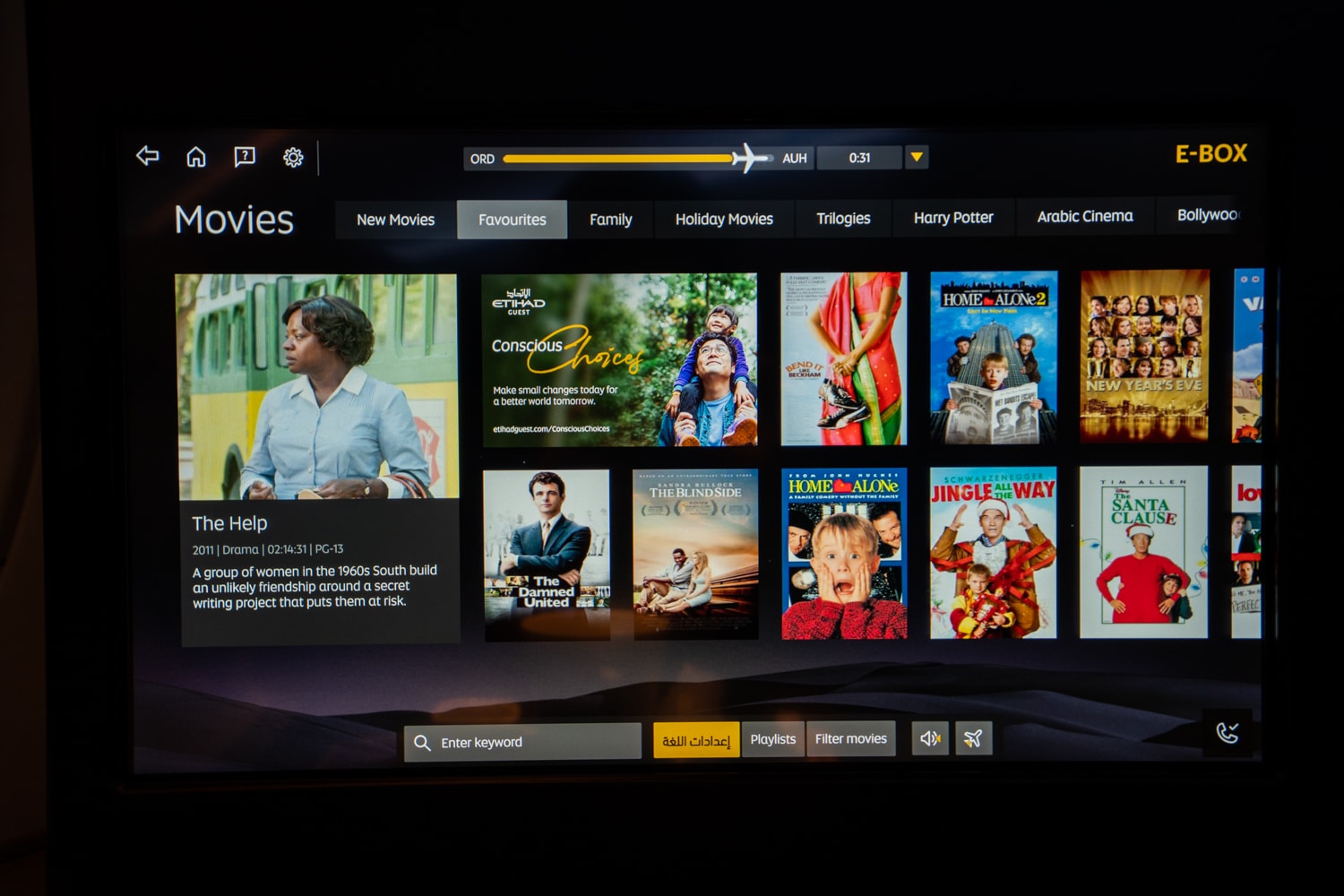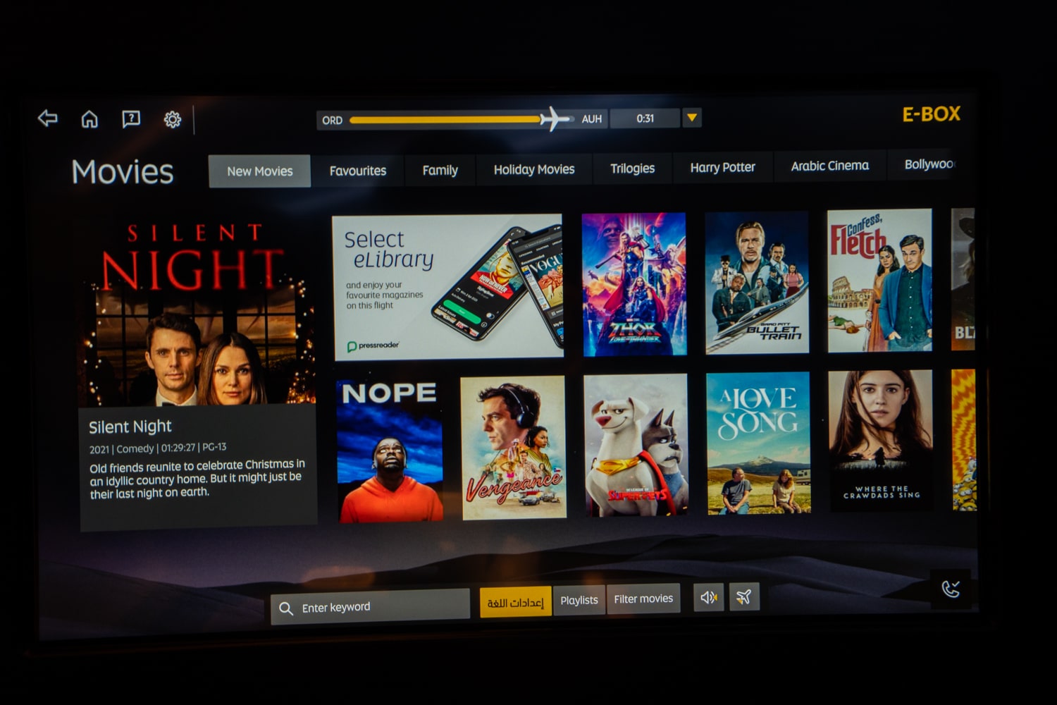 E-Box is Etihad Airways’s in-flight entertainment system. You can find a selection of blockbuster films, live programs, TV shows, music, games, and a selection of around 50 premium magazines in digital format.