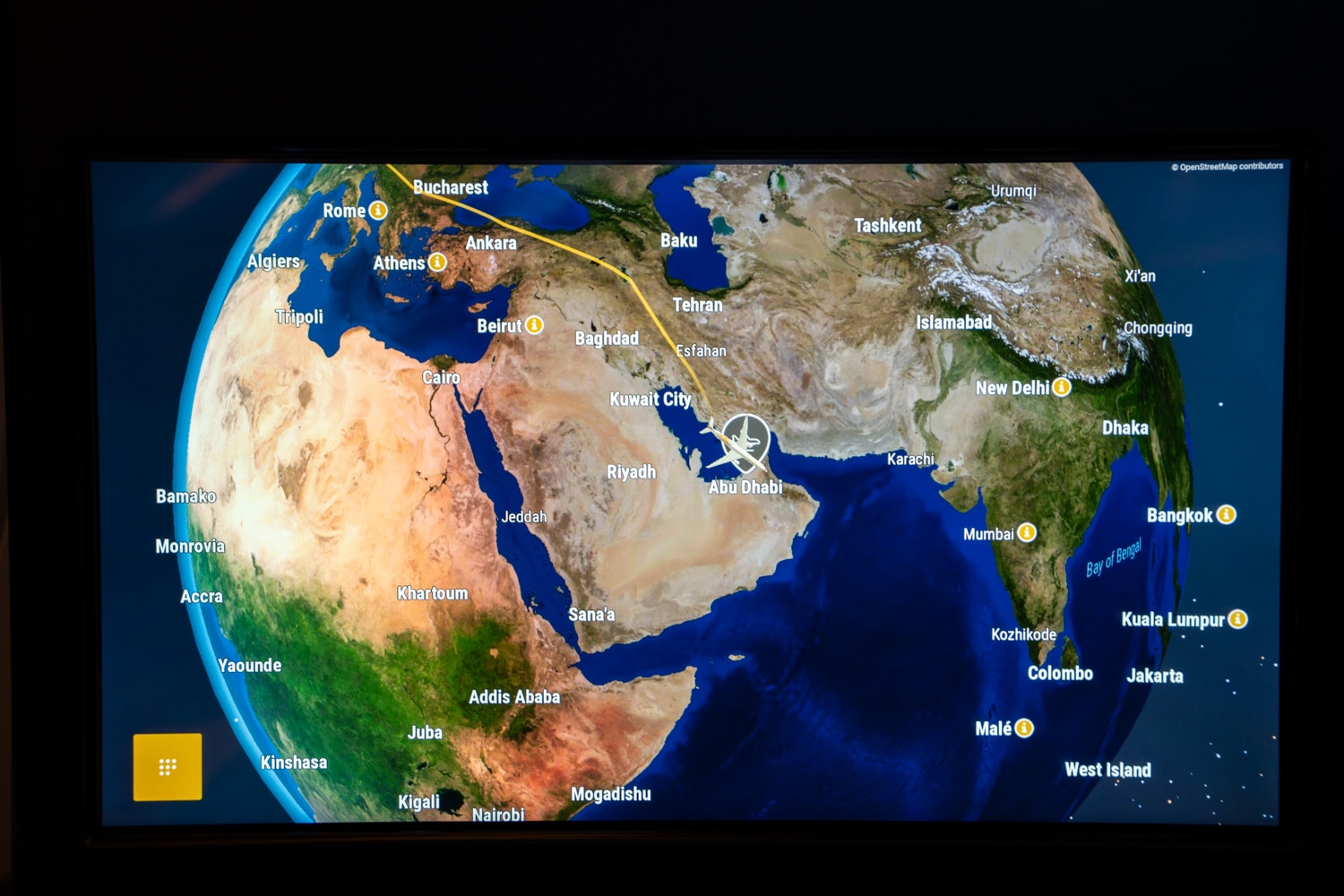 Unfortunately, you won’t find a live tail-mounted camera on the Etihad Airways A350-1000 business class, but you can easily follow along with your flight using the real-time airshow.