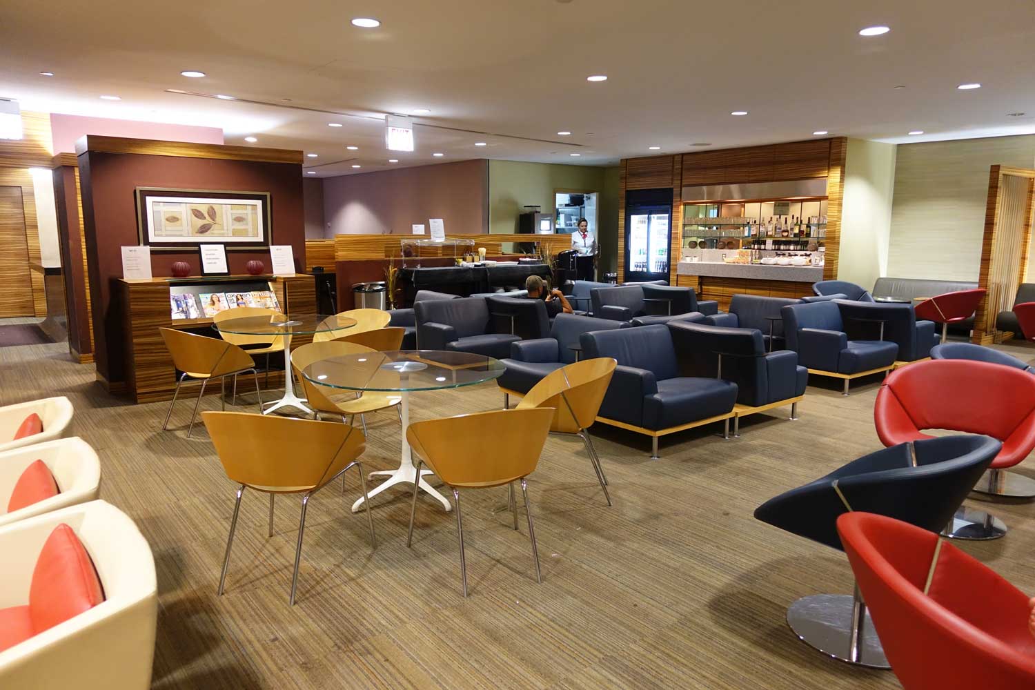The Swissport Lounge is a small, somewhat unremarkable space with only a handful of seats. There isn’t a very wide selection of food or drinks, and the lounge lacks windows to let in natural light or offer views of the apron.