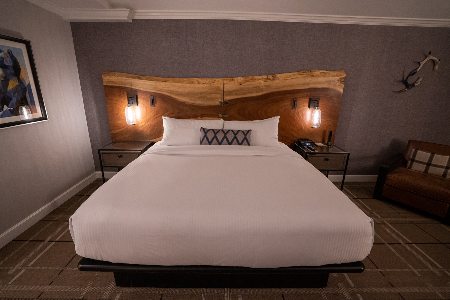 Upon entering, you’ll be greeted by the king bed as the centrepiece, complete with a large live-wood headboard.