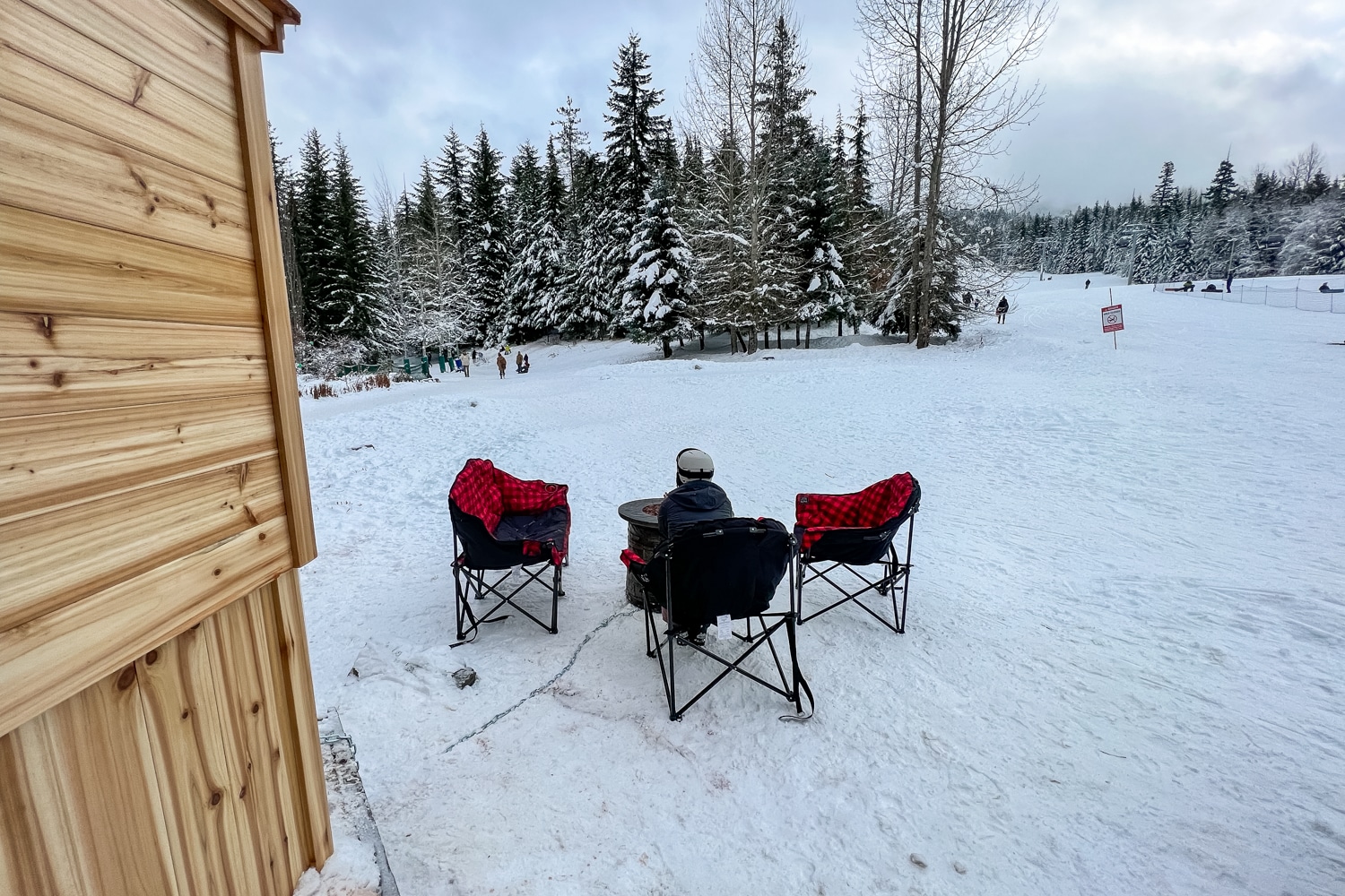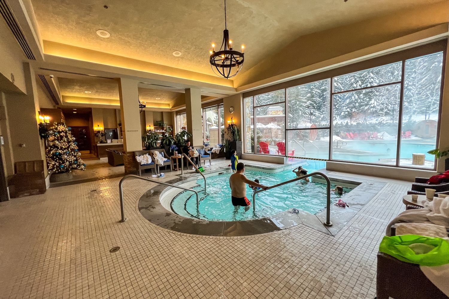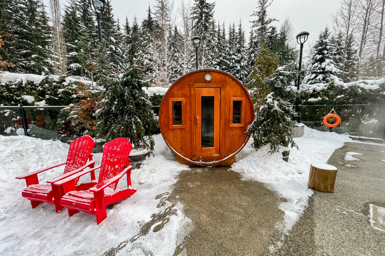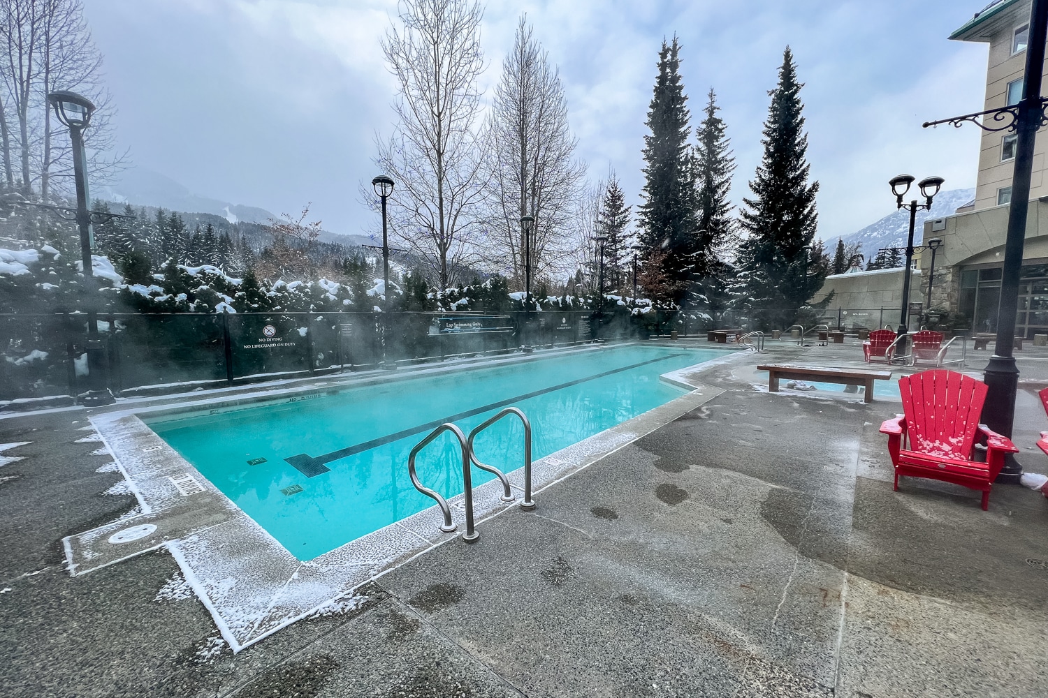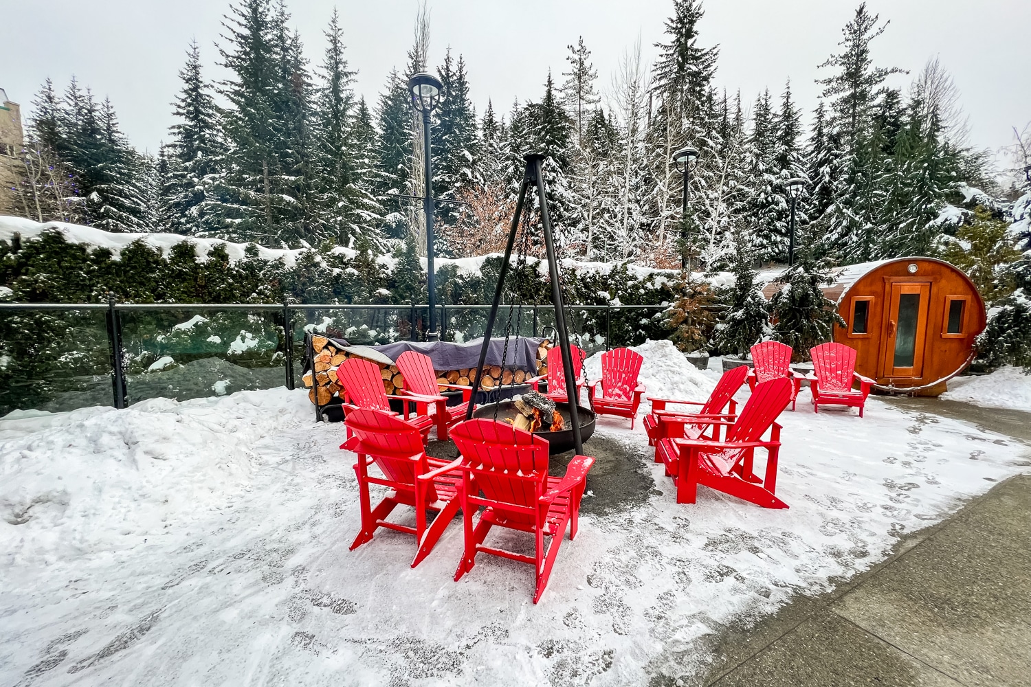 The pool facilities are indeed striking, with snow-capped mountains as the backdrop, bright red chairs dotted around a warm fire pit, and tall pine trees surrounding the area. Additionally, there’s a bar that opens here in the evening for poolside drinks.