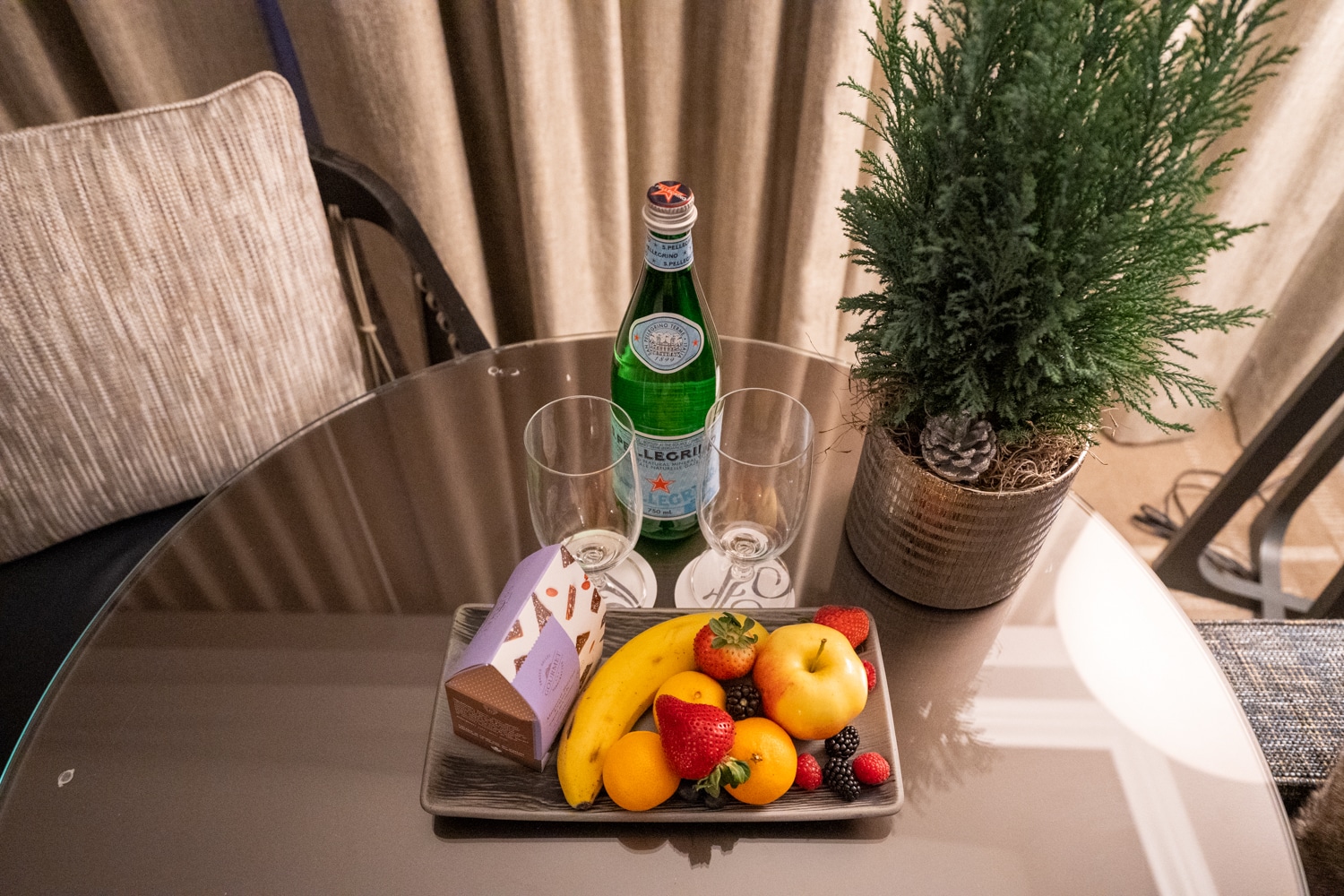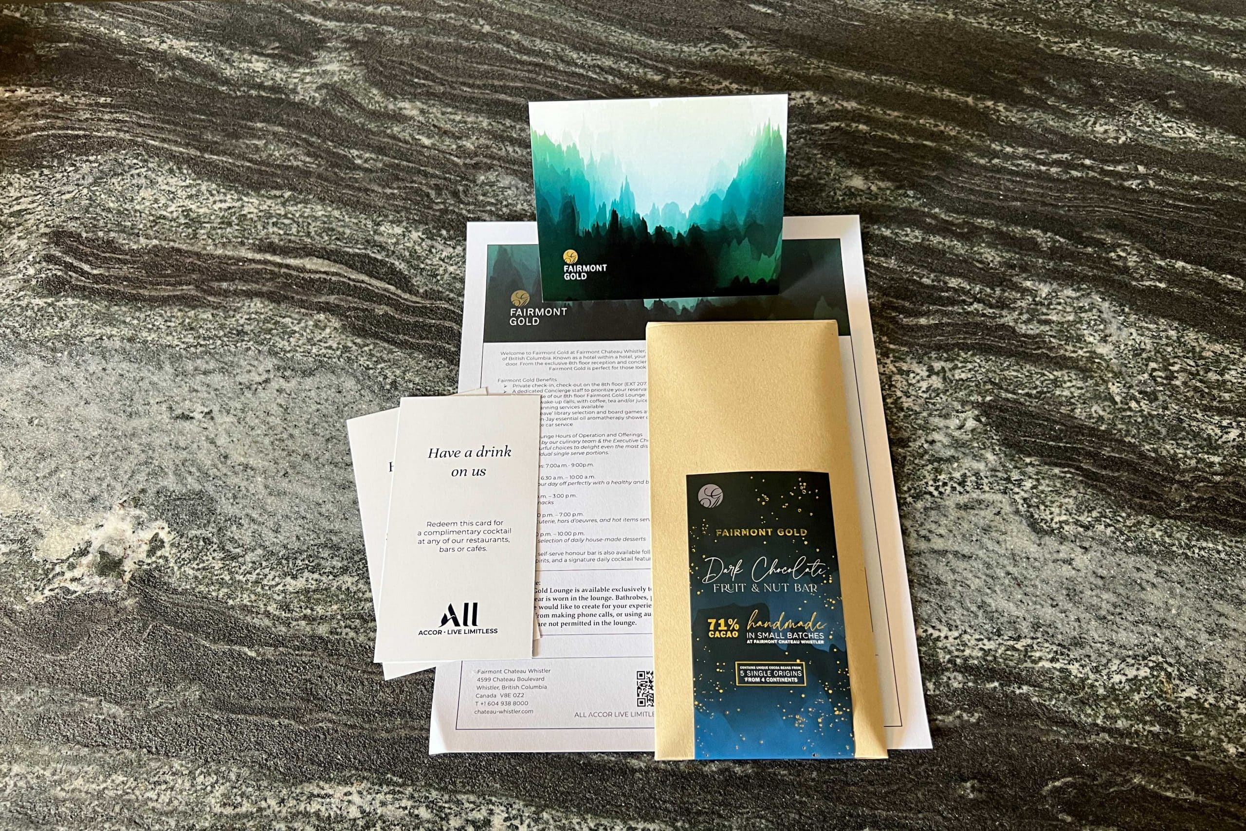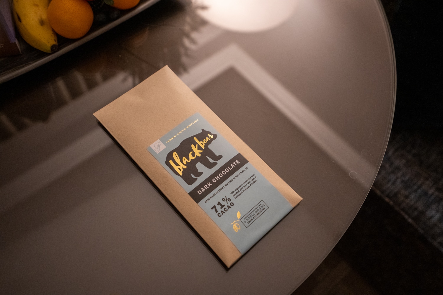 On the table was a welcome gift in the form of fruit, sparkling water, and gourmet chocolate from the Fraser Valley, as well as Blackbear dark chocolate made in Whistler.