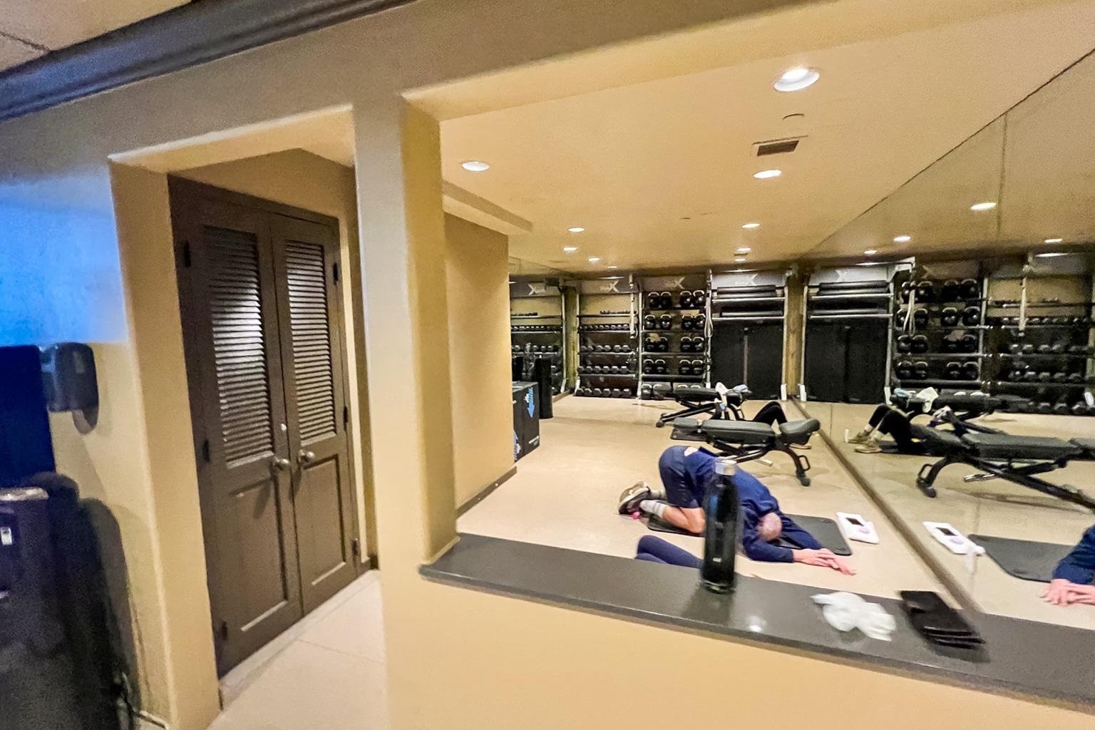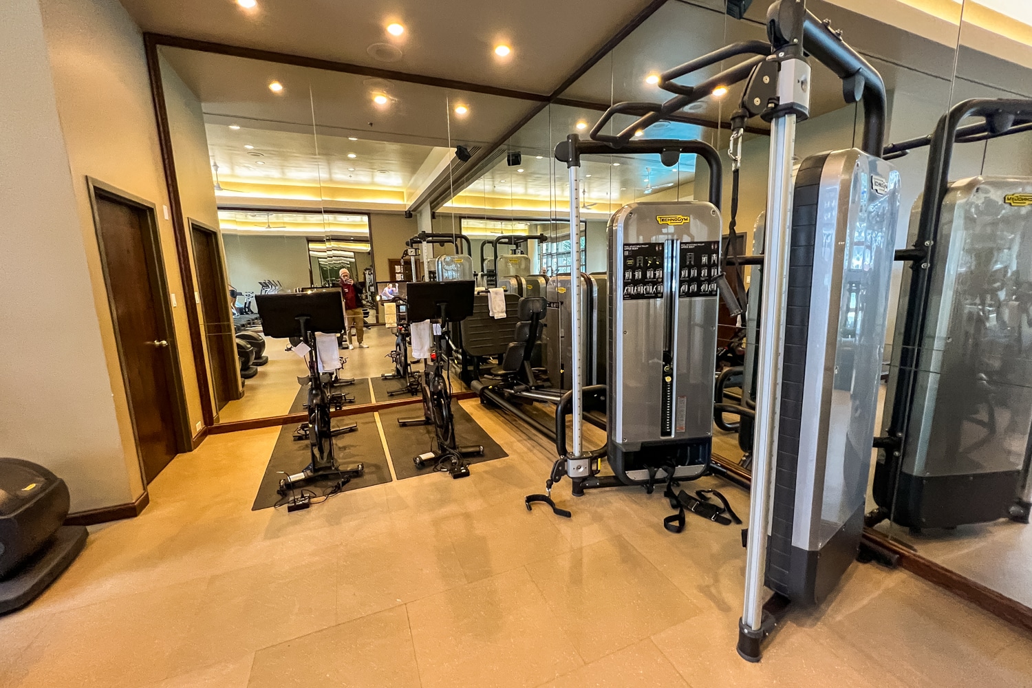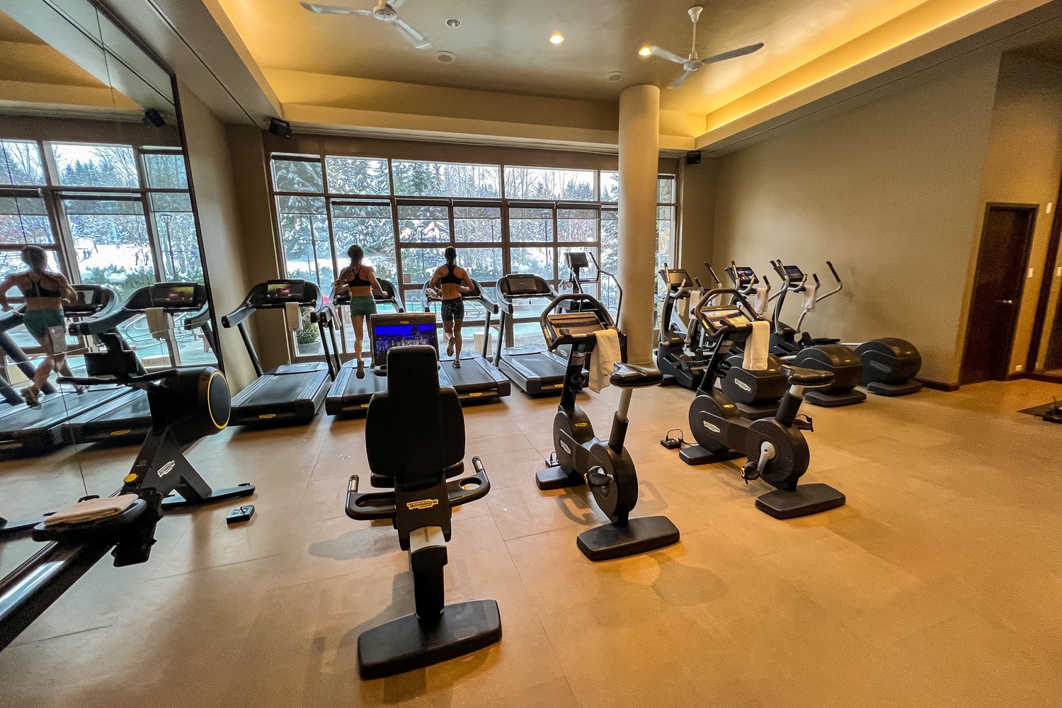 The fitness centre overlooks the outdoor pool area. It’s well-equipped with cardio equipment, including treadmills, ellipticals, and bikes, as well as weight machines and free weights.